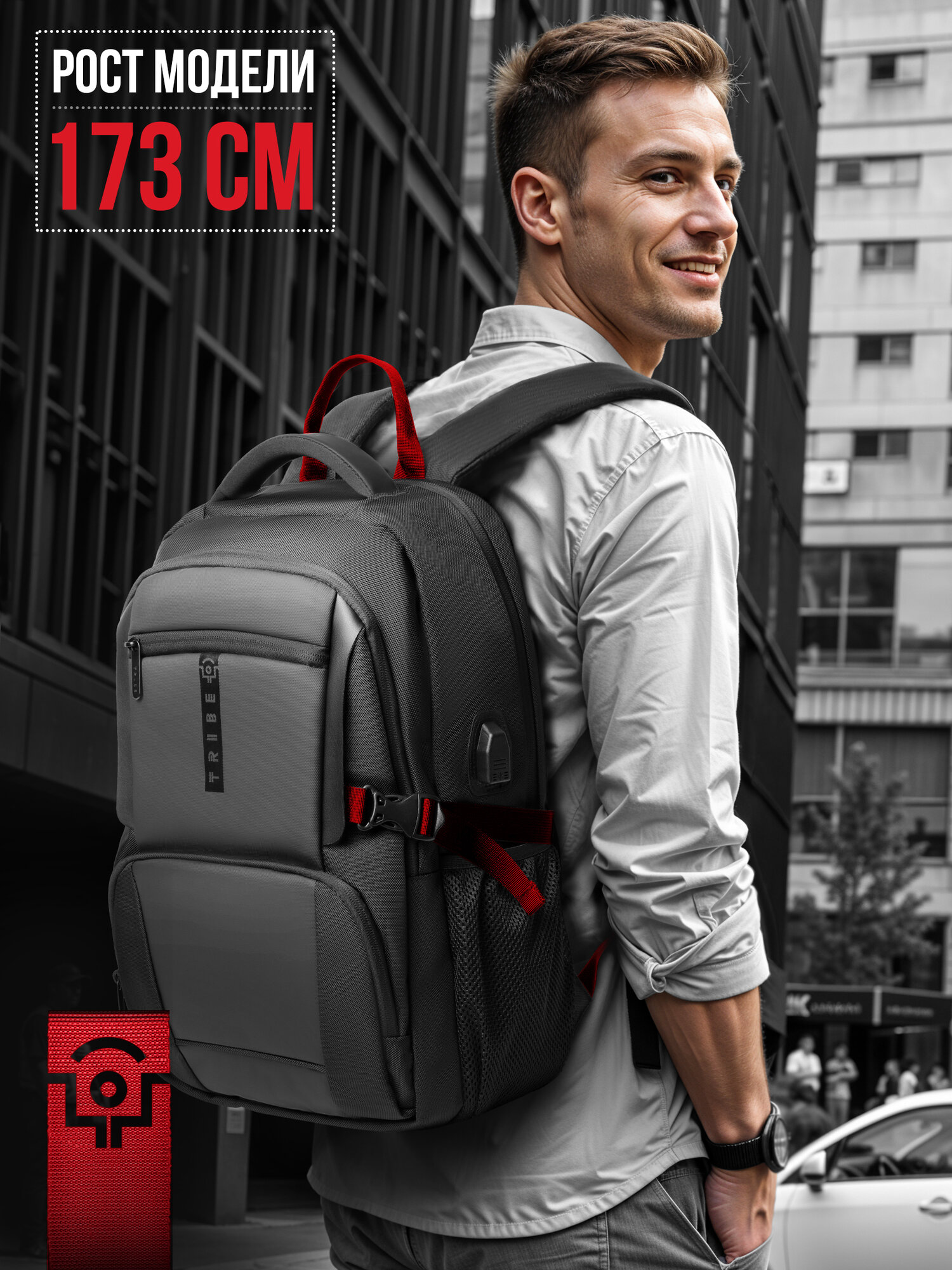 Снаружи рюкзак мужской Tribe Vibe выполнен из качественного материала, который устойчив к повреждениям и не пропускает воду. Спинка рюкзака — мягкая и сетчатая, что способствует свободной циркуляции воздуха. Лямки — регулируемые по длине, удобные и мягкие. В модели также предусмотрено две верхних ручки для переноски изделия в руках: облегченная тканевая и эргономичная. Все отделения рюкзака закрываются на фирменные двойные молнии с металлическими бегунками.