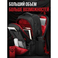 Для канцелярии, документов и других мелочей в рюкзаке предусмотрено второе отделение. Тут большое количество карманов, в том числе на молнии и карман-сетка. Для закрепления ключей есть специальный карабин. На фронтальной части рюкзака расположилось еще два кармана на молниях для мелочей — один из них объемный. В спинке и на одной из лямок разместились потайные карманы для ценных вещей на молниях. По бокам рюкзака — два боковых сетчатых кармана на резинках для бутылок с водой или зонта. В спинку вшита багажная лента, на одной из лямок рбкзака — крепежная петля для очков, а сбоку изделия — внешний USB-порт для быстрой подзарядки мобильного на ходу.
