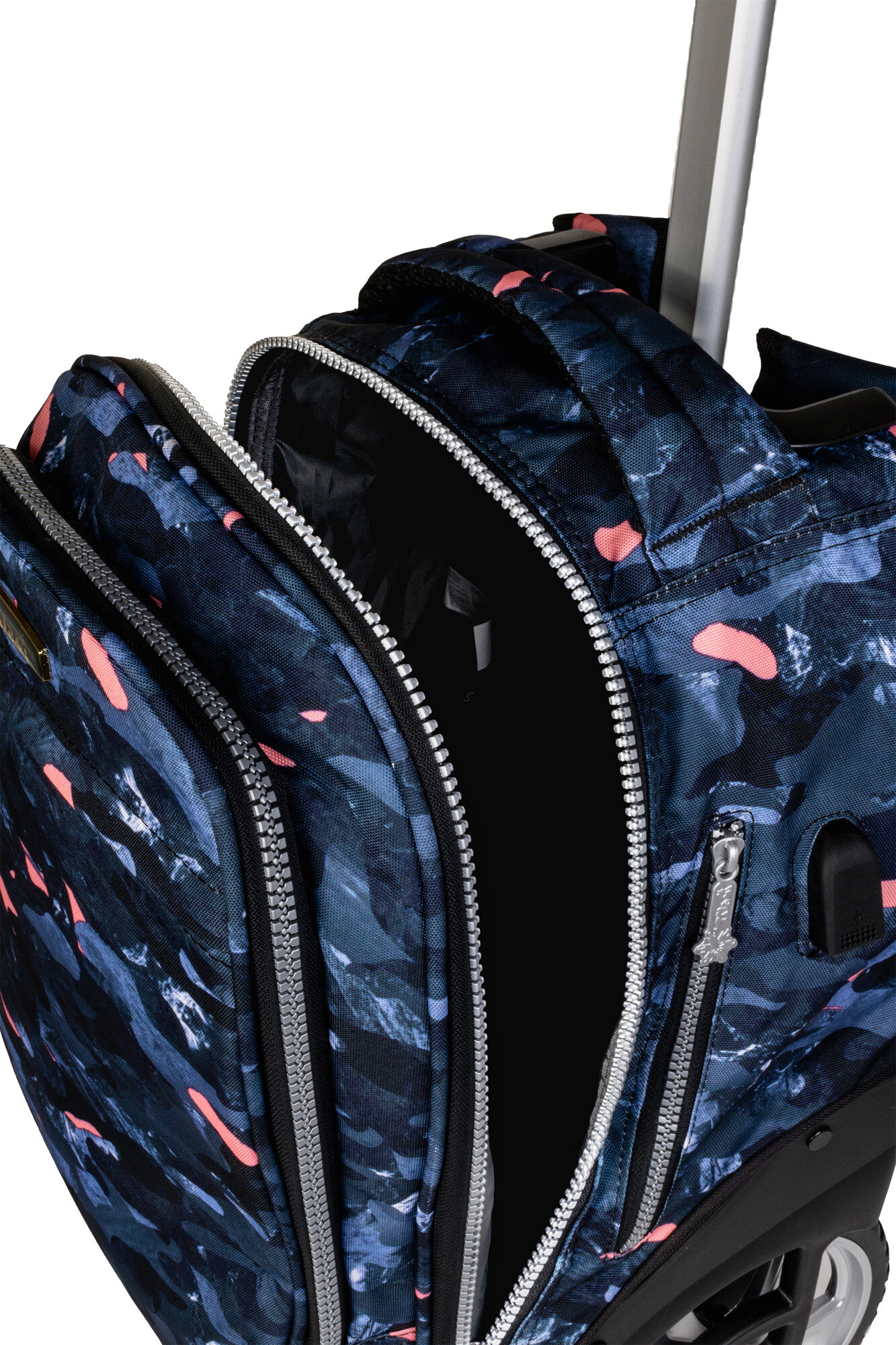 USB-выход, без наполнения, водоотталкивающая пропитка, выдвижная ручка, жесткое дно, колесики, разделитель в главном отделении, разъем для наушников, ручка для переноски, светоотражающие элементы, чехол от дождя