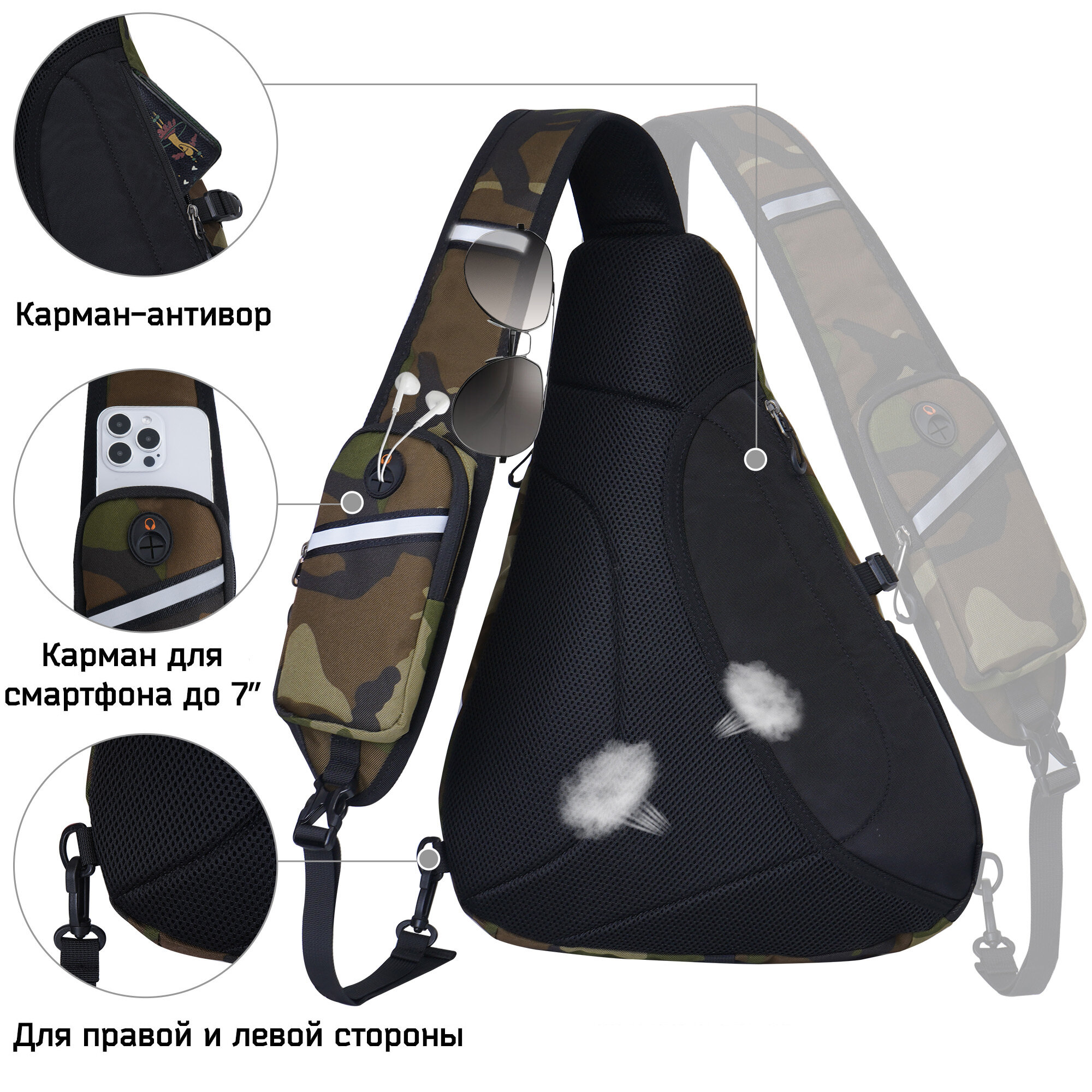 Функциональный однолямочный рюкзак с карманом для смартфона. Удобная анатомическая форма в виде треугольника очень удобна для однолямочного типа ношения рюкзака. Передний фронтальный карман на молнии с карабином для ключей Потайной карман для документов и кошелька в спинке рюкзака Карман для смартфона (до 7") на лямке рюкзака Внутренний карман вмещает планшет до 10,2" Внешний эластичный шнур для одежды Боковой карман-сетка для бутылки Светоотражающие элементы Возможность смены лямки для левши и правши. Крепление на карабине. Вес рюкзака 340 гр. Размеры рюкзака: 50х35х13 см