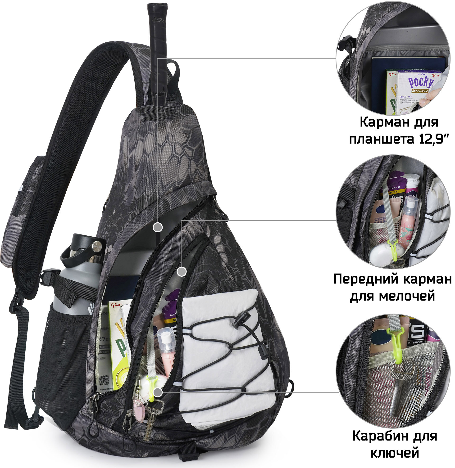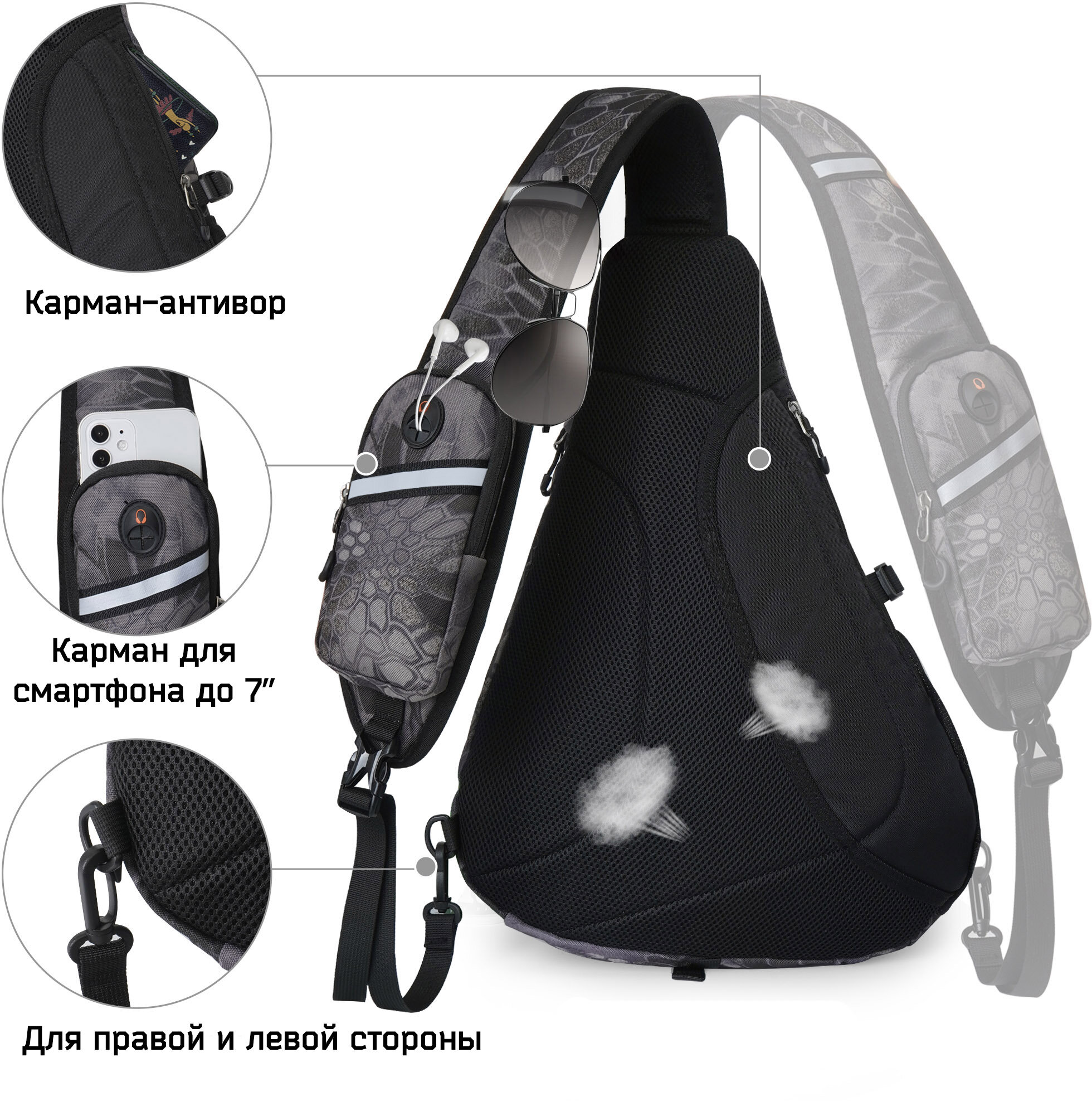 Функциональный однолямочный рюкзак с карманом для смартфона. Удобная анатомическая форма в виде треугольника очень удобна для однолямочного типа ношения рюкзака. Передний фронтальный карман на молнии с карабином для ключей Потайной карман для документов и кошелька в спинке рюкзака Карман для смартфона (до 7") на лямке рюкзака Внутренний карман вмещает планшет до 10,2" Внешний эластичный шнур для одежды Боковой карман-сетка для бутылки Светоотражающие элементы Возможность смены лямки для левши и правши. Крепление на карабине. Вес рюкзака 340 гр. Размеры рюкзака: 50х35х13 см