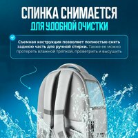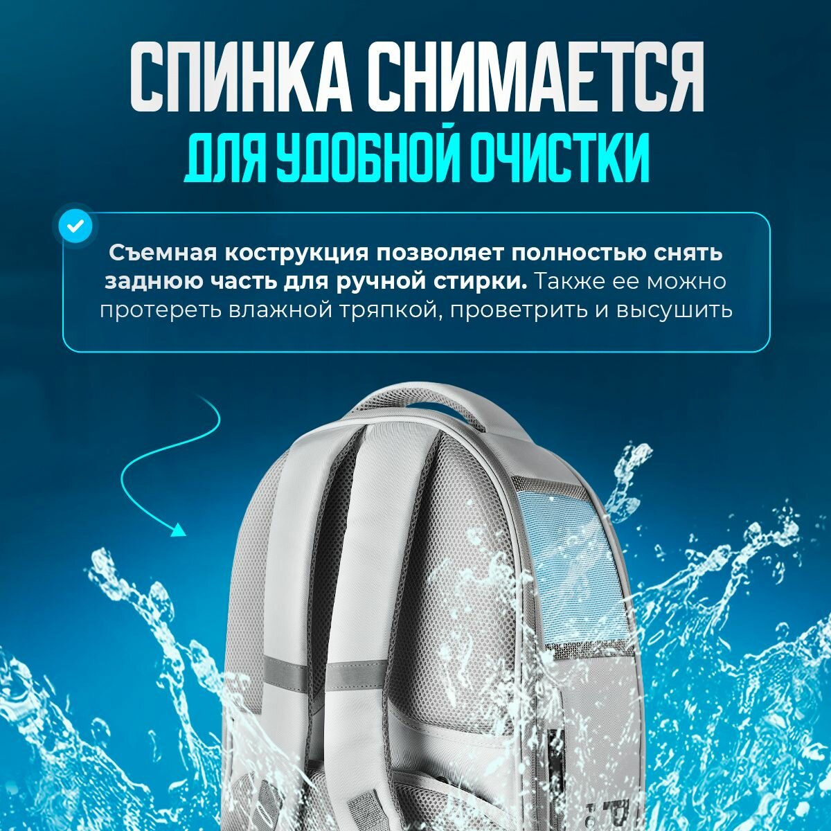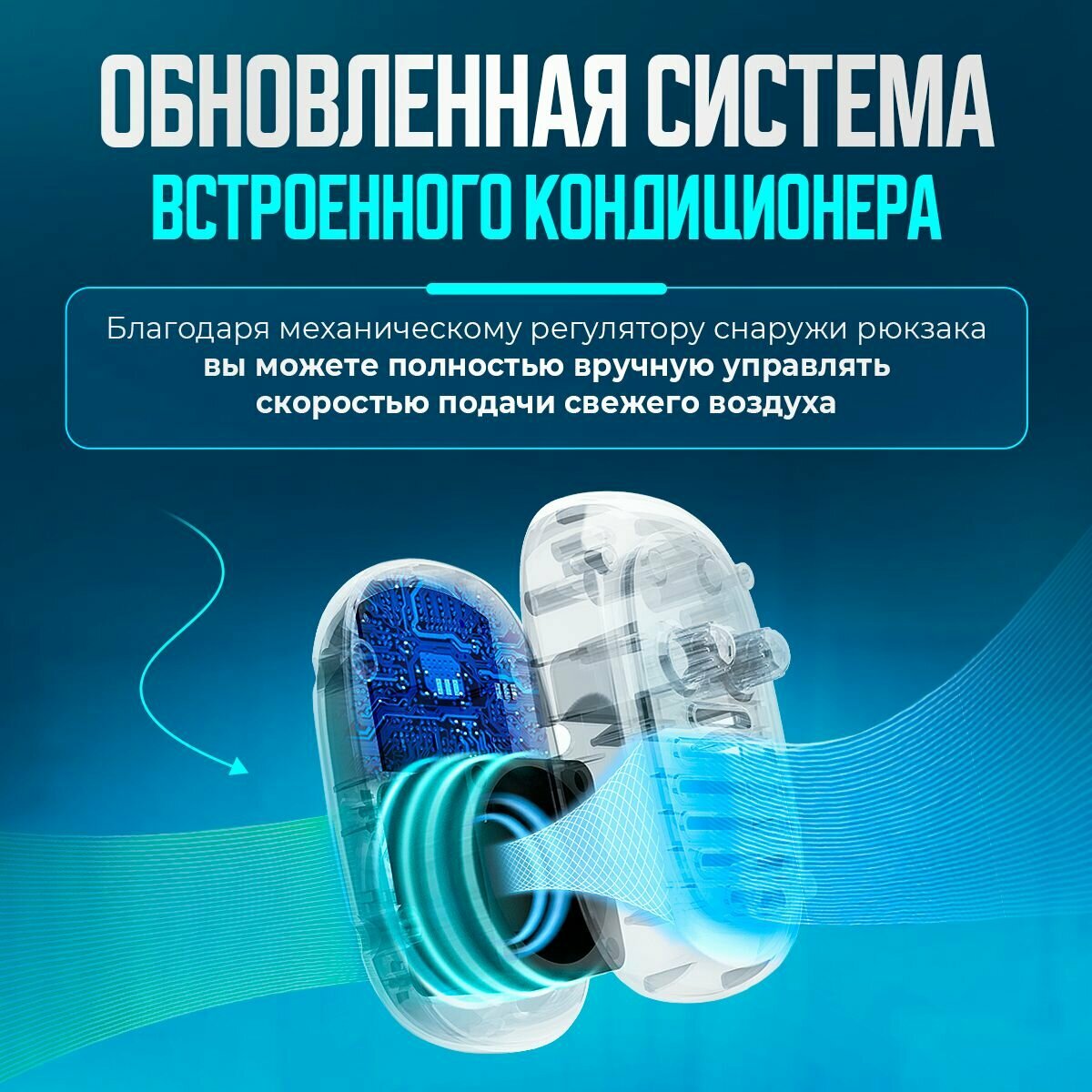 Рюкзак оснащен поддержкой поясницы, светоотражающими деталями на лямках, блокировкой замков и удобным карманом для внешнего аккумулятора. Освещение и вентиляция работают от аккумулятора, который приобретается отдельно.