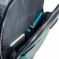 Новая версия наиболее популярной модели рюкзака CA3214B2, только в увеличенном варианте, из коллекции Piquadro Blue Square. Изготовлен рюкзак из гладкой телячьей кожи с восковой пропиткой и голубым кантом. В отличие от своего "младшего брата" данная модель рюкзака имеет высоту в 43 см, что дает возможность поместить, в специальное отделение, ноутбук размером до 15.6 дюймов и планшет. Также в рюкзаке расположено ещё два кармана на молнии, в одном из которых предусмотрены отсеки для телефона и письменных принадлежностей. На задней стенке рюкзака расположено крепление на дорожную сумку. Объем 19 л.