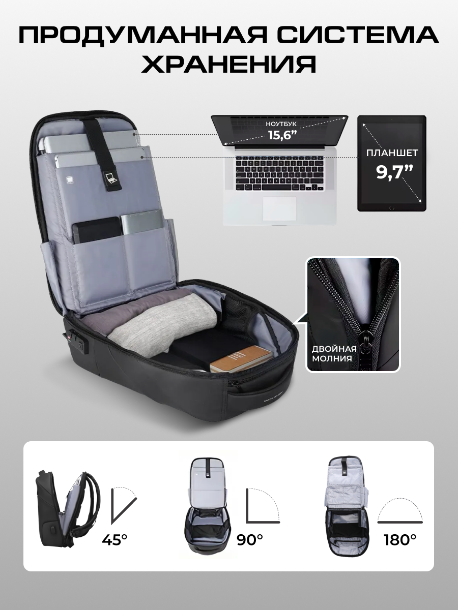 | Конструктивные особенности | антивор, вентиляция спины, нагрудный ремень, ремешок крепления ноутбука, ручка сверху, эргономичные лямки |