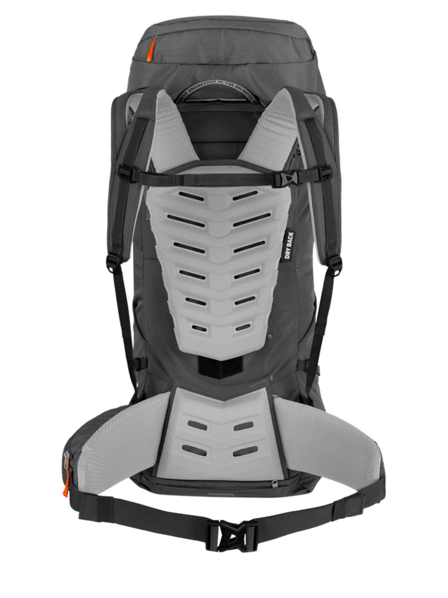 Рюкзак оснащён подвесной системой Dry Back Custom с регулируемой по длине спинкой, анатомическими плечевыми лямками, поясом и поясничной поддержкой для индивидуальной посадки. Система идеально подходит для длины торса 46 - 60 cм. Разгрузочные стропы на лямках помогают лучше подогнать рюкзак по спине на длинных дистанциях, а формованный пояс обеспечивает плотное прилегание и равномерное распределение нагрузки на бёдра. Лёгкая конструкция рюкзака позволяет снизить общий вес и сэкономить силы на подъеме. Система Dry Back с подкладкой из пены EVA и трехмерными вентиляционными каналами способствует хорошему воздухообмену и вентиляции даже в жаркую погоду, а раздвоенные плечевые лямки обеспечивают свободу движений для такого крупного рюкзака.