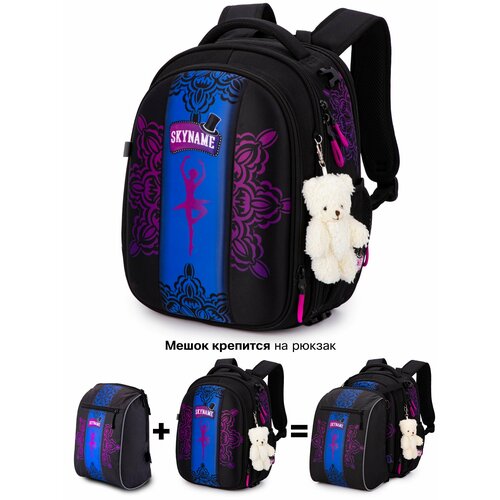 Правильный школьный рюкзак для девочки — это всегда отличный вариант юной ученице! Модель от SkyName (СкайНейм) с анатомической спинкой и мишкой на брелоке, объемом 16 л идеально подходит для начальной школы. Эргономичная спинка с мягкими вставками заботится о здоровье позвоночника ребенка. S-образные лямки с регулируемым ремнем обеспечивают комфорт. Даже полный этот портфель для учебы сохраняет свою правильную форму благодаря жесткому каркасу. Крепкая водоотталкивающая ткань надежно защищает вещи внутри от непогоды. Вместительное пространство организовано умно: основное отделение с разделителями для учебников, задний отсек для папок формата А4, ноутбука или планшета, и передний карман с органайзером для канцелярии. По бокам — сетчатые карманы для бутылки. Безопасность школьницы на улице обеспечивают светоотражающие элементы. Качественная фурнитура, усиленная конструкция и мягкие ограничители внутри делают этот аксессуар невероятно практичным и продуманным. Все молнии расстегиваются полностью и в обе стороны, позволяя ранцу удобно раскрываться. В комплекте идет мешок для обуви на карабинах. Этот модный и универсальный товар станет лучшим выбором для спорта, прогулок или путешествий. Первоклассница оценит такой красивый и оригинальный подарок на 1 сентября или Новый год — ведь с ним все необходимые принадлежности, гаджеты и интересные мелочи будут всегда в полном порядке.