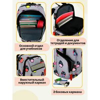 Рюкзак выполнен из прочного и долговечного полиэстера, что обеспечивает его долгий срок службы. Рюкзак имеет два отделения для учебников и документов, а также карман для планшета и телефона. Кроме того, предусмотрены три внешних кармана на молнии для хранения различных канцелярских мелочей, ключей и других необходимых предметов.