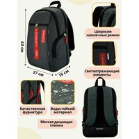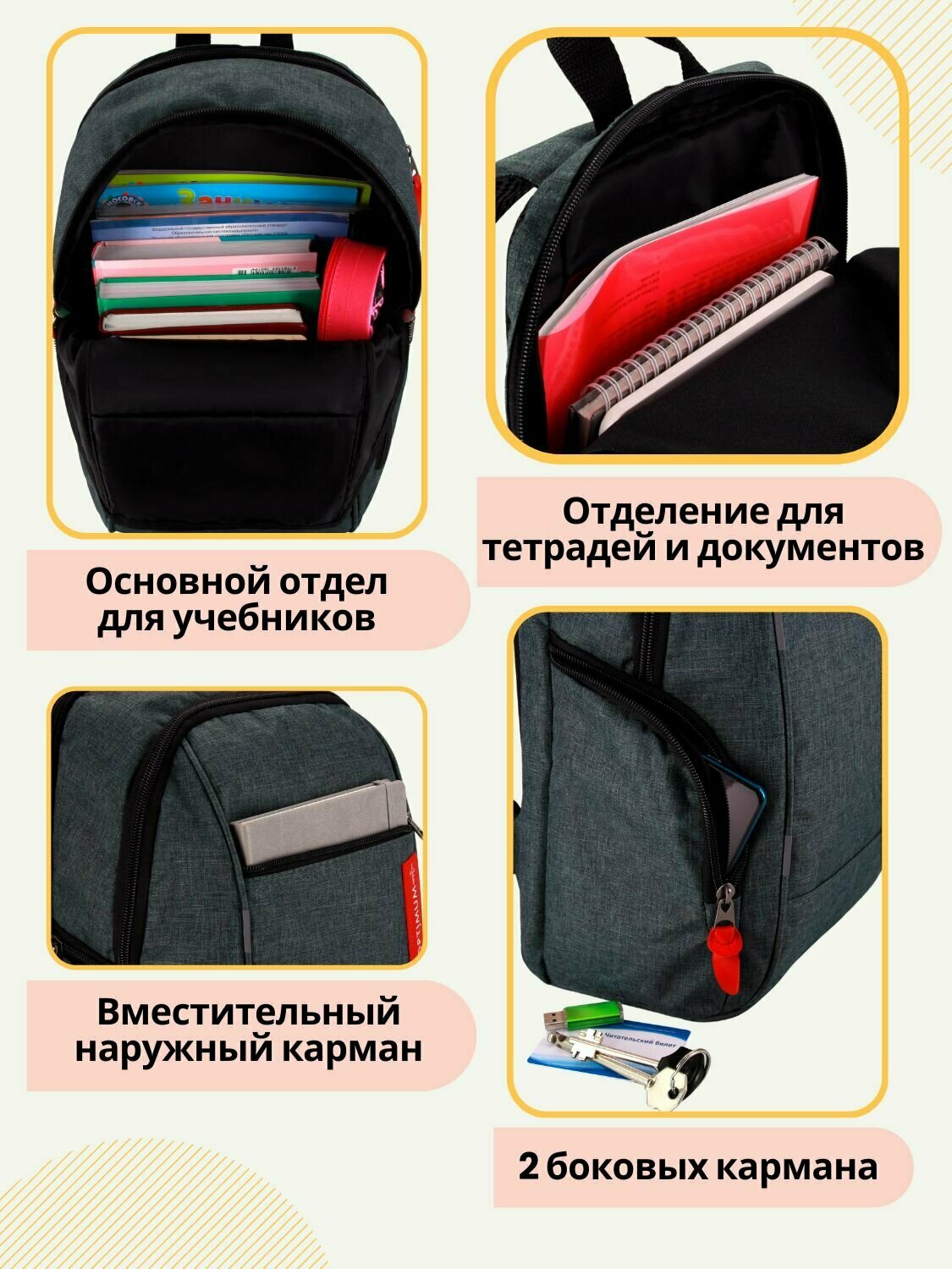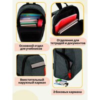 Рюкзак выполнен из прочного и долговечного полиэстера, что обеспечивает его долгий срок службы. Рюкзак имеет два отделения для учебников и документов, а также карман для планшета и телефона. Кроме того, предусмотрены три внешних кармана на молнии для хранения различных канцелярских мелочей, ключей и других необходимых предметов.