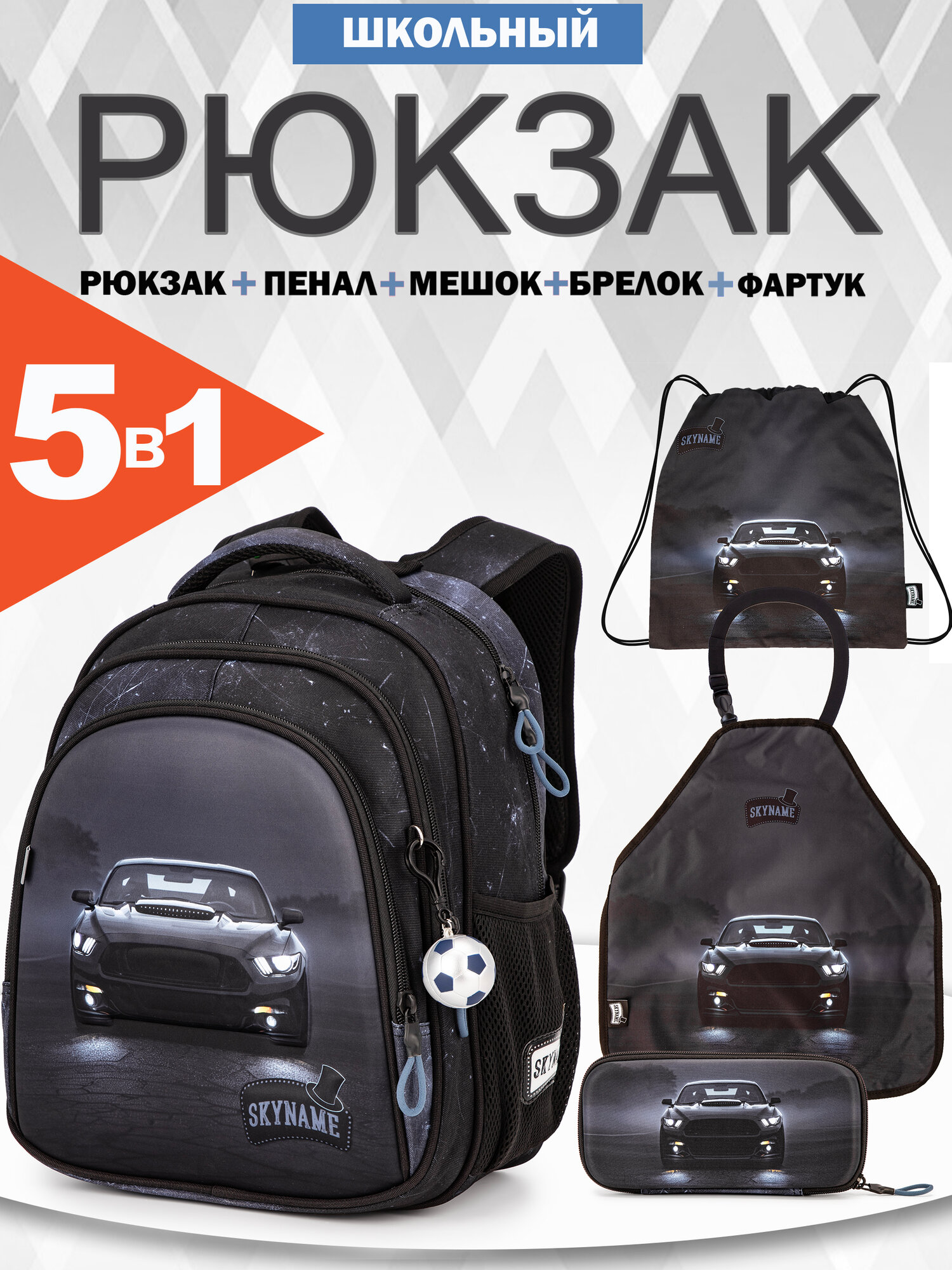 Купить Рюкзак школьный для мальчика первоклассника, набор 5 в 1 (мешок, пенал, фартук) + брелок, SkyName (СкайНейм) с доставкой по всей России.