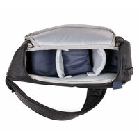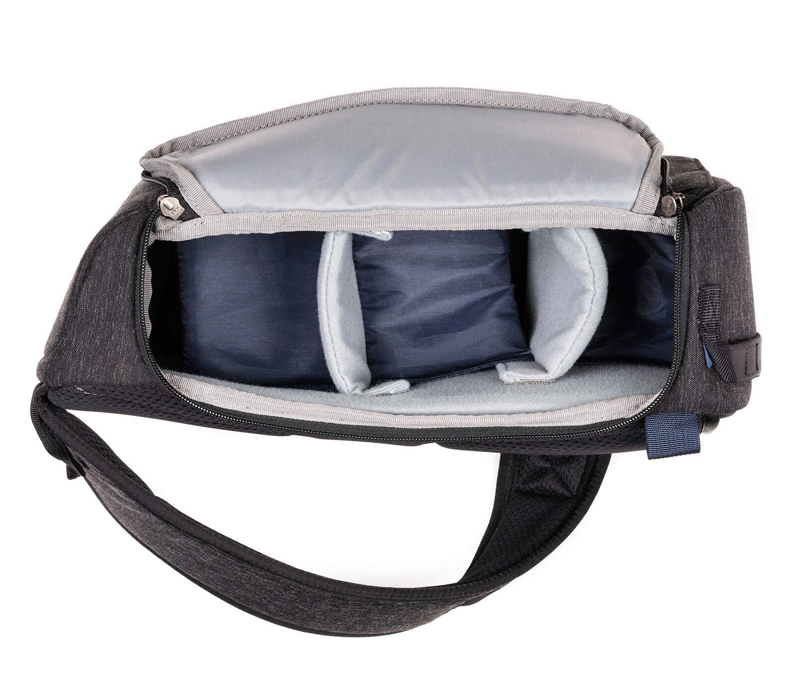 Доступ к технике открывается через боковые клапаны, когда вы перекидываете слинг со спины на грудь. Внутреннее пространство, как обычно, организуется с помощью плотных разделителей на липучках-велкро. Конструкция поперечных разделителей позволяет установить один небольшой объектив поверх другого таким образом, чтобы они не бились друг об друга, и чтобы вы в то же время могли достать нижний, не отстегивая липучку. По бокам слинга располагается по одному карману на молнии с органайзером для мелочей: можно положить телефон, запасную карту памяти, аккумулятор и так далее. В передний карман можно положить пару зимних перчаток, складной зонт или небольшой штатив. Чтобы лучше зафиксировать слинг на спине, когда вы передвигаетесь активно (например, едете на велосипеде), можно пристегнуть второй вспомогательный ремень.