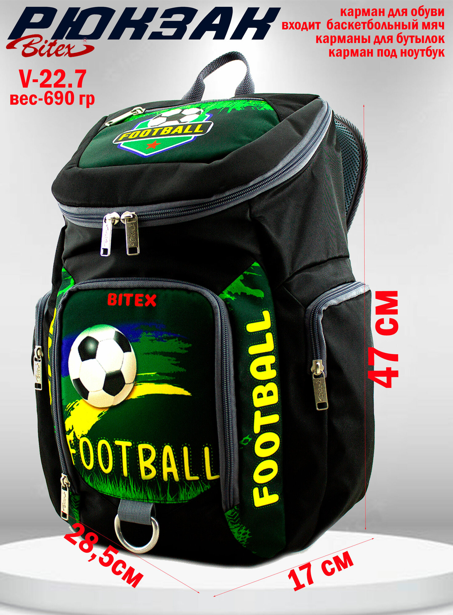 Рюкзак спортивный BITEX 28-121 для футболистов, с карманом для обуви, черный п. э./ футбольный мяч: сравнение цен, характеристики, фото, актуальное наличие и цены.