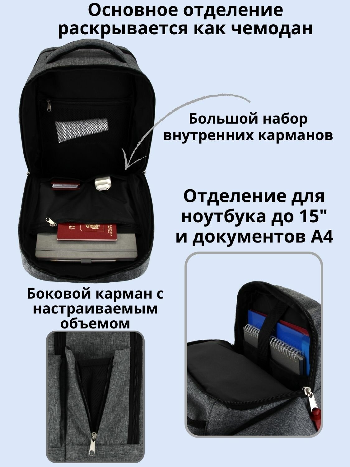 карман для бутылки, карман для документов, карман для планшета, карман для телефона, крепление веревки, отделение для документов, отделение для ключей, подвесная петля