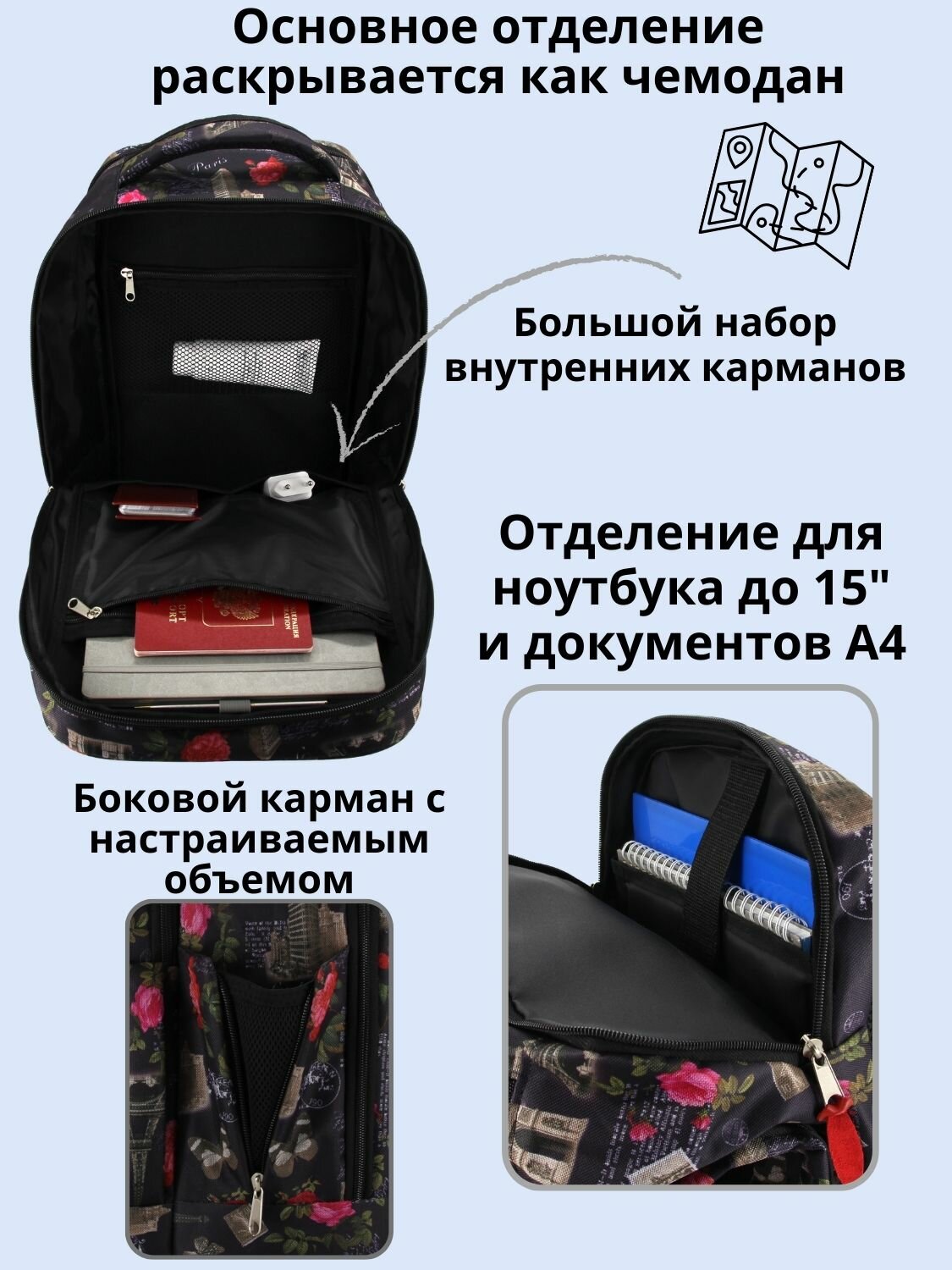 карман для бутылки, карман для документов, карман для планшета, карман для телефона, крепление веревки, отделение для документов, отделение для ключей, подвесная петля
