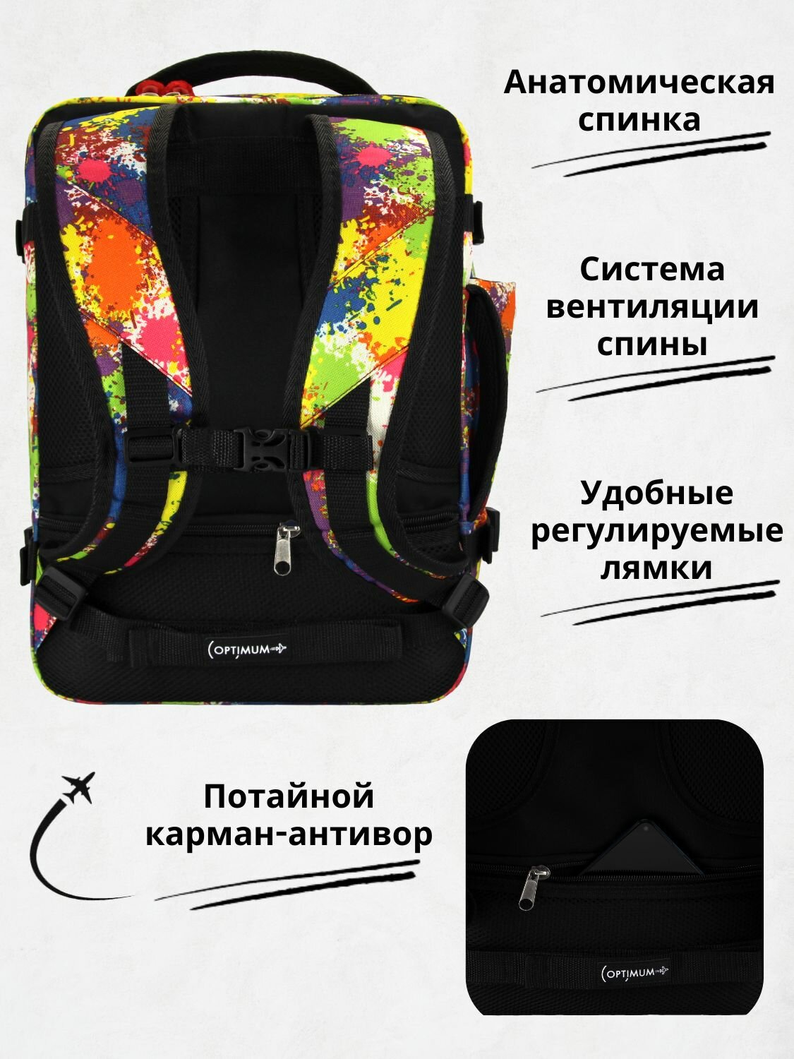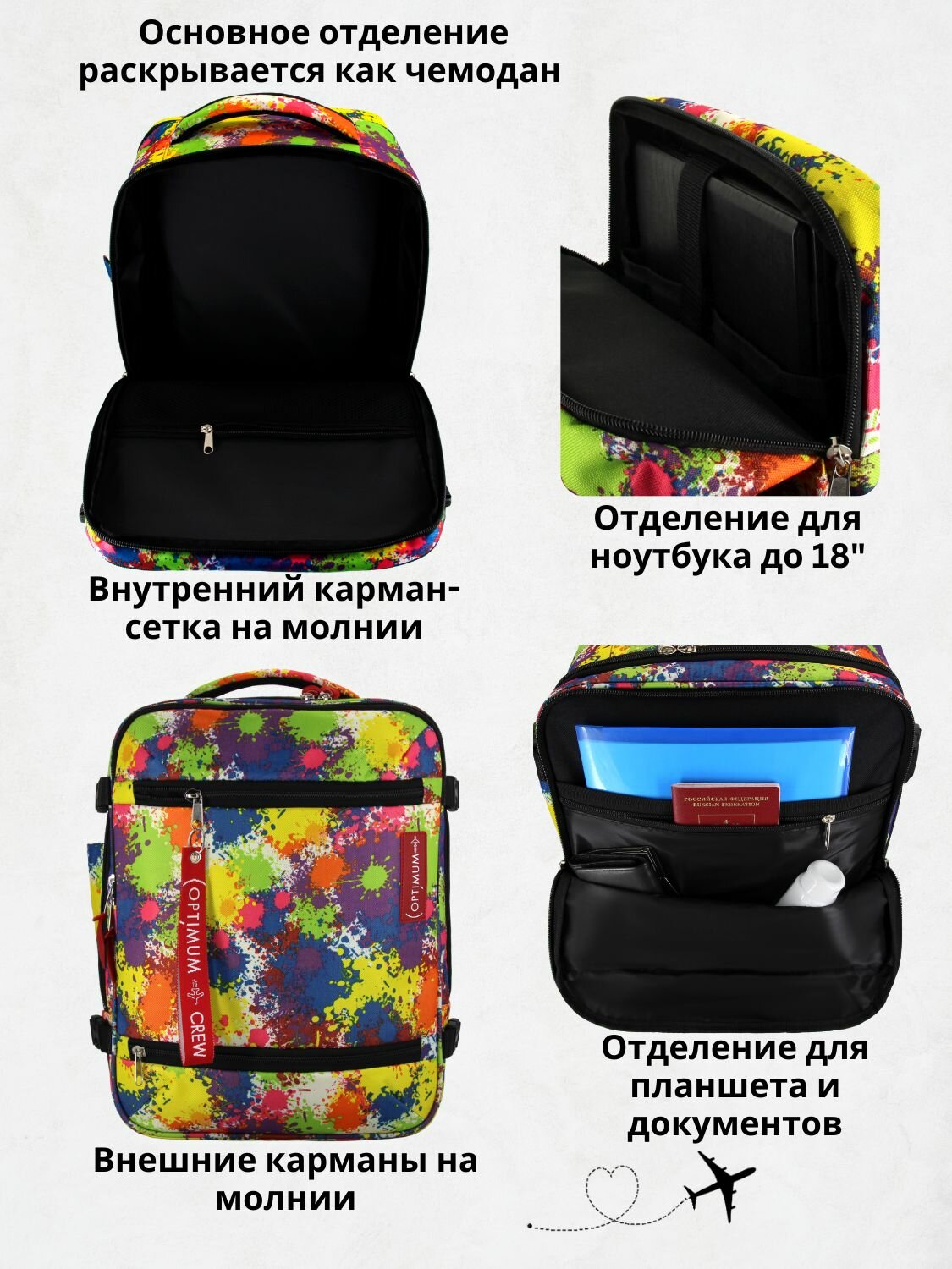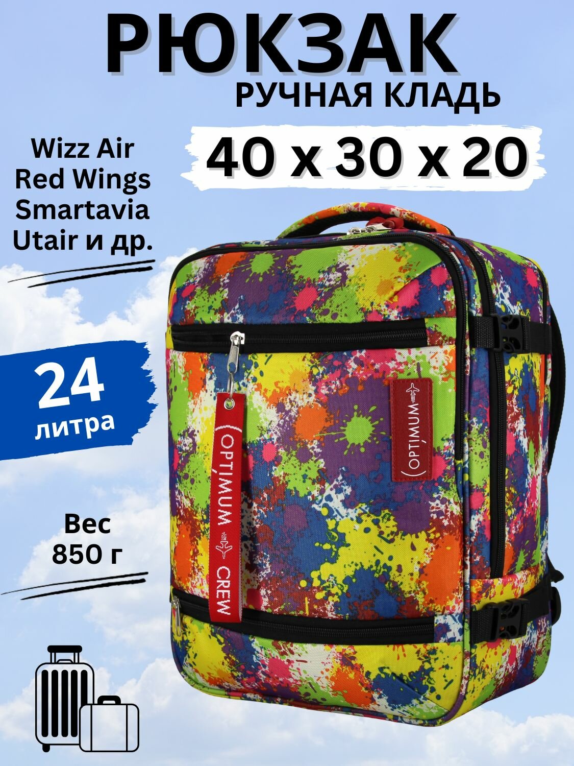 Рюкзак для путешествий дорожный ручная кладь 40х30х20 Wizz Air RL, холи - большой, вместительный, влагозащитный рюкзак для путешествий, деловых поездок, в отпуск и на море объемом 24 литра. Рюкзак чемодан разработан под бесплатные габариты ручной клади 40*30*20 в самолет авиакомпаний Red Wings, Smartavia, Utair и др. Рюкзак 40х30х20 см. унисекс - подойдет мужчине, женщине, подростку, детям и взрослым. Wizz Air - рюкзак для туризма, повседневный городской для прогулок по городу, спортивный рюкзак, сумка дорожная, сумка для фитнеса. Сумка дорожная чемодан с карманом со стороны спины - система антивор - сохранит ваши документы и деньги в безопасности. Рюкзак можно использовать как рюкзак для ноутбука 15.6 дюйма. Отделение - карман для ноутбука планшета с диагональю до 18 дюймов или документов формата A4. Так же можно использовать как туристический рюкзак, дорожный, мужской, женский, детский, повседневный, городской, для туризма, прогулок по городу или как спортивная сумка для фитнеса. У рюкзака для ручной клади для размещения в калибратор 40 30 20 есть две удобные ручки сверху и сбоку. Облегченная модель рюкзака, анатомическая спинка, боковые регулируемые ремни и 2 мягкие лямки обеспечат комфорт в дороге. Дорожный рюкзак в самолет Optimum Wizz Air - стильный, яркий, надежный аксессуар - отличный подарок другу, подруге, коллеге, для мужчин и женщин. Optimum - ваш верный друг в дороге!