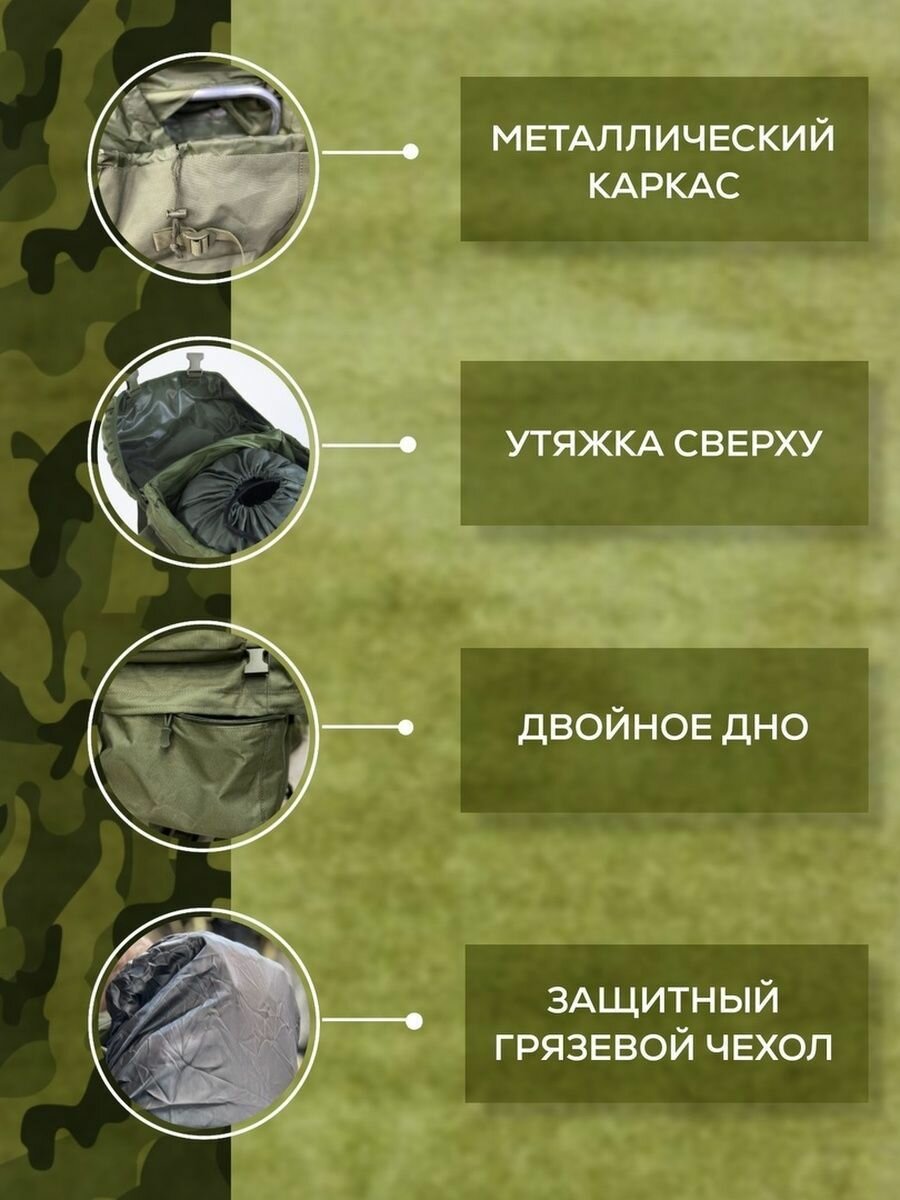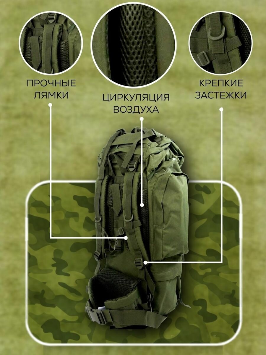 Рюкзак тактический рамный 100 +10 литров - большой и вместительный объем. Изготовлен из высококачественной нейлоновой ткани Оксфорд 1000D. Вам безусловно понравится плотность и качество ткани. Рюкзак туристический- многофункциональный большой рюкзак из прочной и износостойкой ткани. Рюкзак мужской тактический используется для походов, охоты и рыбалка дается намного легче, если использовать военный рюкзак / армейский рюкзак с камуфляжем. Рюкзак милитари сделан из износостойкой и водонепроницаемой ткани. Огромное удобство создает мягкое поясное крепление, сопротивление разрыву,водонепроницаемость и множество удобных карманов. Подходит для всех наружных условий. Сильной стороной данного рюкзака является удобство и комфорт .