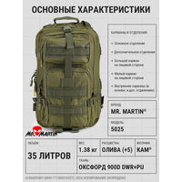 Mr. Martin 5025 рюкзак вместительный, его объем около 35 литров - это потолок для городских рюкзаков. Если вам нужен большой рюкзак для города, то 5025 для вас. Ну и конечно активный отдых: походы, охота, рыбалка, страйкбол и т. д. Все прошито на совесть: детально проработан каждый шов, каждый стежок. Внутри все прошито качественной подкладкой оливкового цвета. Фирменная фурнитура Mr. Martin. В целом - довольно функциональный и предельно надежный рюкзак по доступной цене, который прослужит долгие годы.