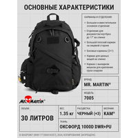 Рюкзак Mr. Martin® 7005 в черном цвете. Объем около 30 литров. Одно основное вместительное отделение, 5 внешних карманов (1 спереди, 3 сбоку, 1 сзади), автономное отделение для ноутбука и документов. Одна из главных фишек данного рюкзака - убираемый внешний модуль для дополнительного крепления предметов снаружи (одежда, шлем и т. д.). Ткань влагозащищенный Oxford 1000D, молнии и пластиковая фурнитура от KAM®.