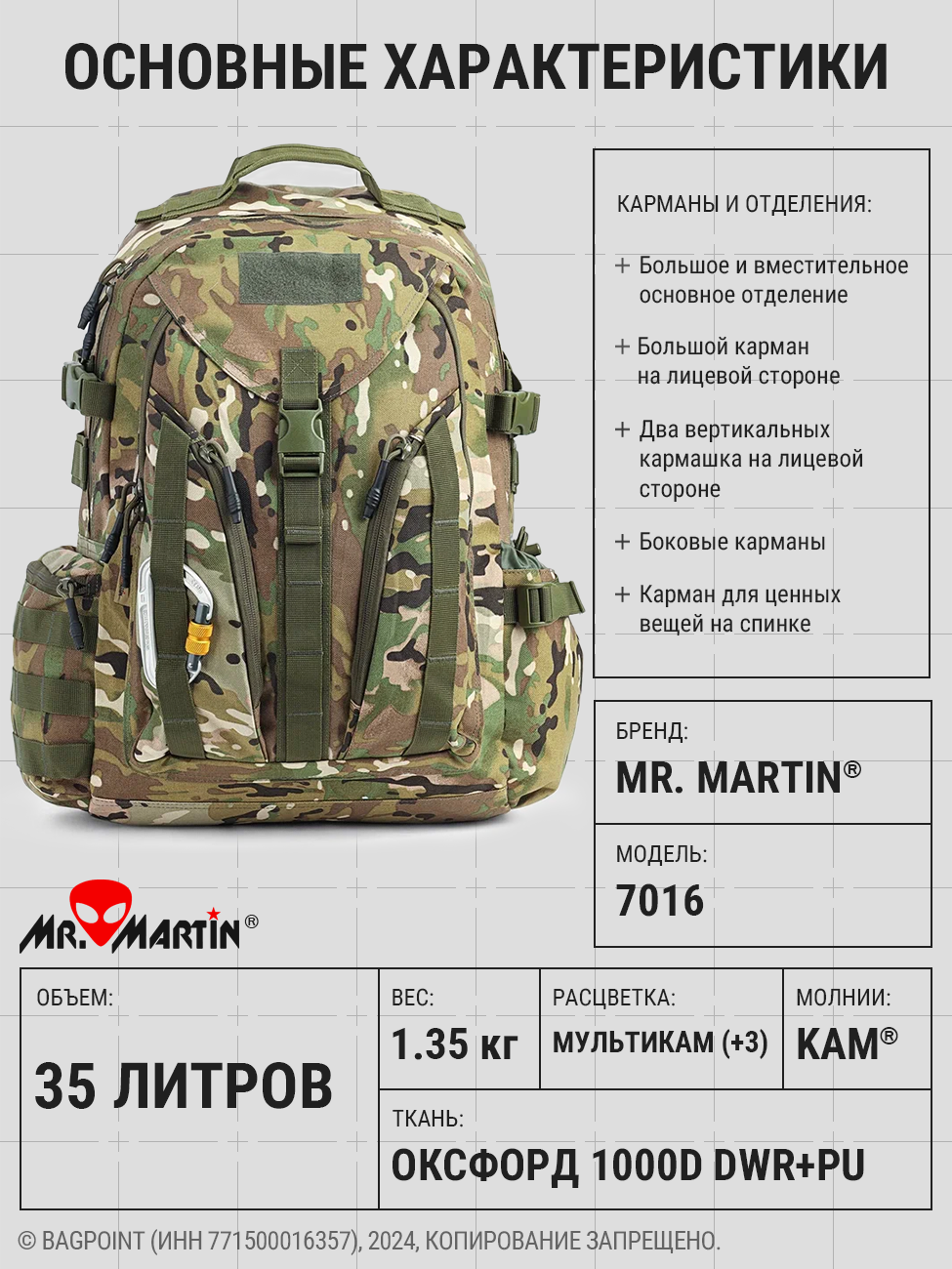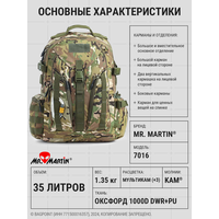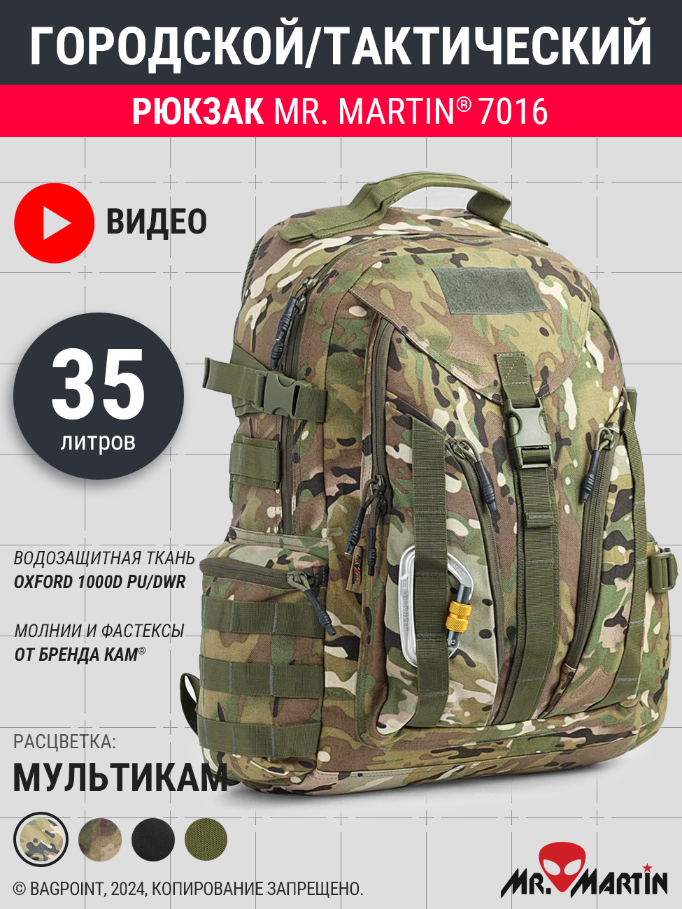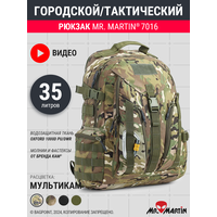 Рюкзак тактический Mr. Martin® 7016 в расцветке Мультикам. Объем около 32-33 литра. Одно основное вместительное отделение, 6 внешних карманов (1 большой спереди, 2 малый вертикальных спереди, 2 по бокам, карман на спинке). Ткань влагозащищенный нейлон 900D (Nylon), молнии и пластиковая фурнитура от KAM®.