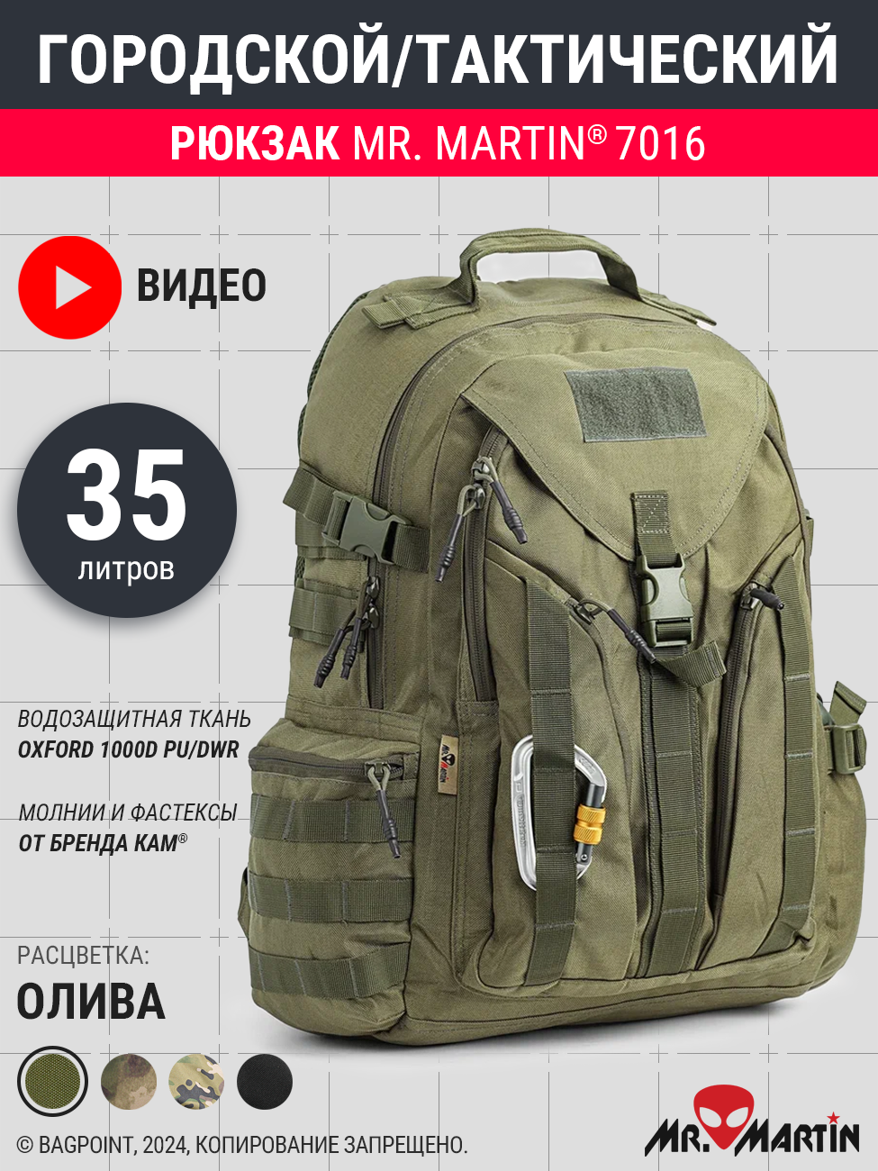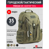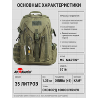 Рюкзак тактический Mr. Martin® 7016 в расцветке "Олива". Объем около 35литров. Одно основное вместительное отделение, 6 внешних карманов (1 большой спереди, 2 малый вертикальных спереди, 2 по бокам, карман на спинке). Ткань влагозащищенный Oxford 1000D, молнии и пластиковая фурнитура от KAM®.