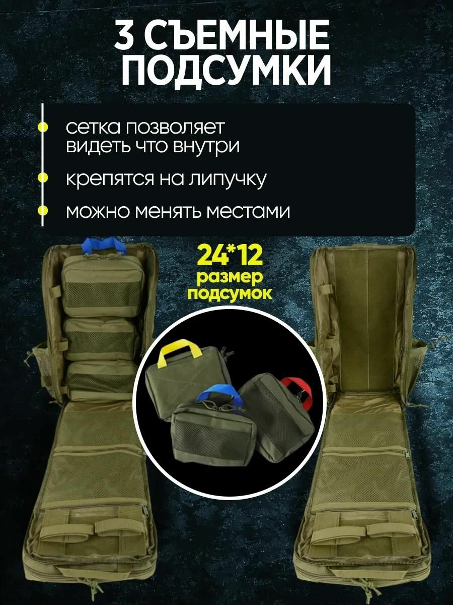 Рюкзак тактический медицинский спортивный на 30 литров с 3 подсумками для путешествий и военных действий. Большой рюкзак армейский туристический выполнен из материалов оксфорд нейлон полиэстер. Камуфляжный рюкзак можно использоваться в армейских, туристических, штурмовых и походных целях. Штурмовой рейдовый облегченный универсальный можно взять на рыбалку, охоты, в поход, в горы. Медицинское оборудование, приборы для тактической медицины будут теперь всегда будет под рукой - армейский вещмешок оборудован специальными карманами и отсеками для медицинских принадлежностей, лекарства, мелкого оружия, тактического оборудования и многое другое. Охотничий вещмешок тканевый оснащен системой Molle, что позволяет поместить больше вещей, водонепроницаемый и быстросохнущий, выполнен из качественных материалов, имеет надежное крепление, качественные швы и премиальную фурнитуру. Непромокаемый текстильный с водоотталкивающей пропиткой для активного отдыха. Туристический походный ранец имеет регулируемый поясной ремень с мягкой вентилируемой подкладкой для комфорта. Спортивный подсумок подойдет для сплавов, занятий горным и военным туризмом, альпинизмом, страйкболом. Военная сумка имеет много отделений и карманов, для ношения оружия, припасов и для инструмента. У ранца для рыбалки имеется анатомическая ручка и мягкая ортопедическая спинка, которая минимизирует давление на спину, обеспечивая защиту и комфорт. Портфель тканевый может использоваться в любое время года и при любых погодных условиях. Защищен плотным слоем, который защитит его от порезов, влаги и грязи, обеспечивая прочность и защиту. Портфель медика станет отличным подарком для любого мужчины, солдата, мужа, папы парня. Идеальный презент охотнику или рыболову. Универсальность и легкость в использовании делают его привлекательным выбором для многих.