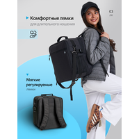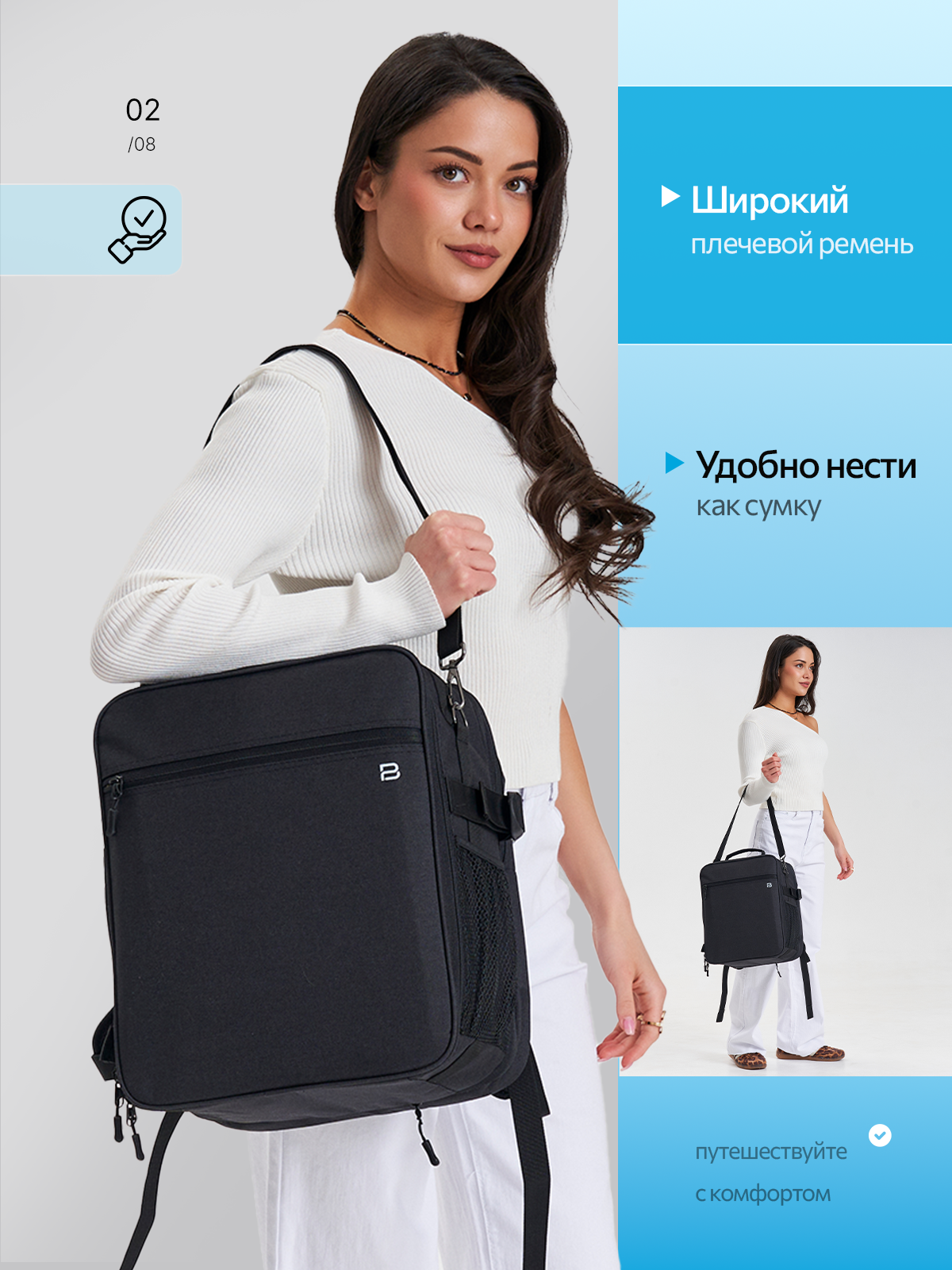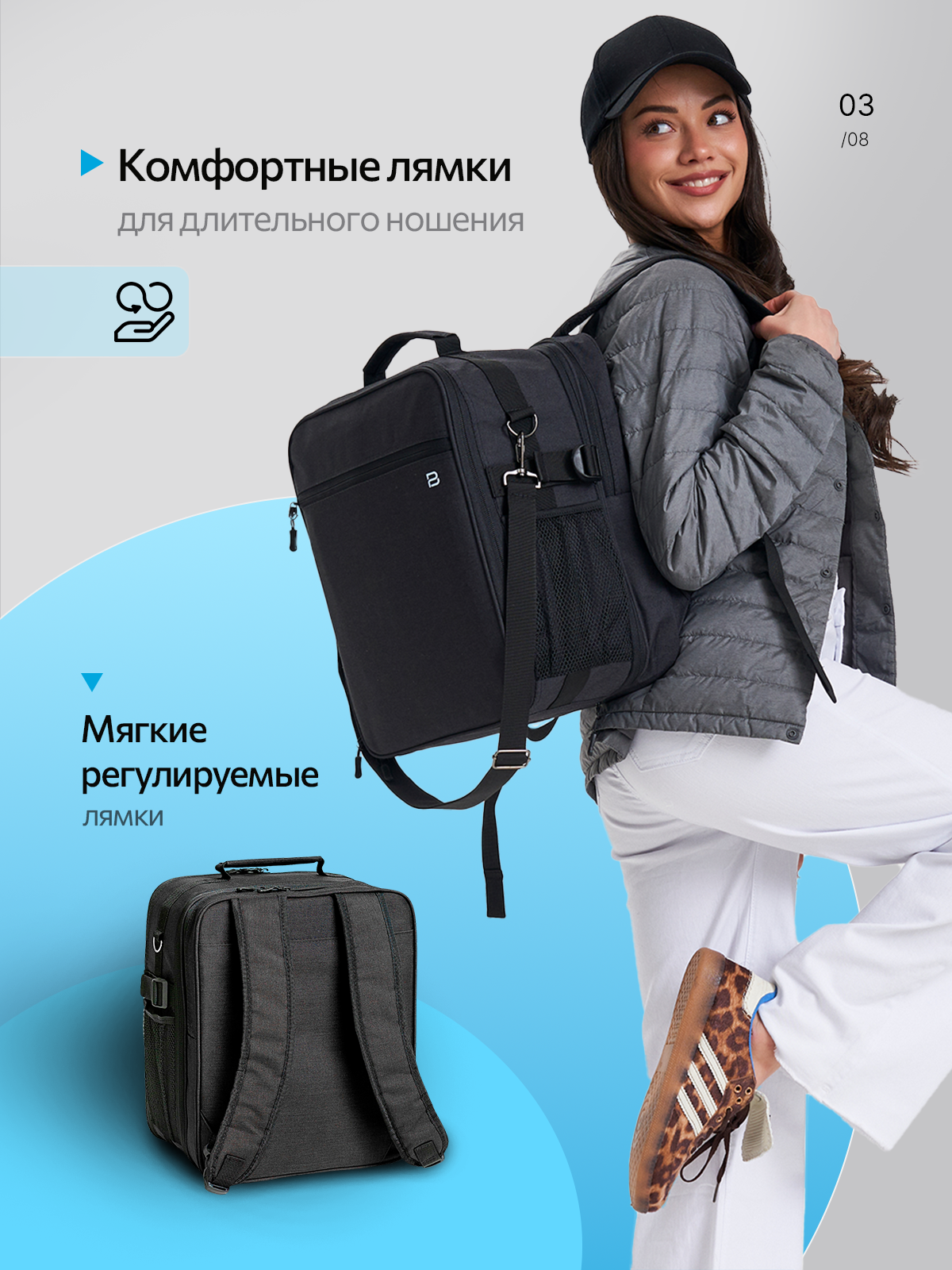 Дорожный рюкзак-трансформер Pobedabags Black Base 36х30х27/20 — Ваш идеальный спутник для путешествий! Ищете идеальный рюкзак для путешествий? Наша дорожная сумка-трансформер Pobedabags — это ручная кладь, которая Вам нужна! Ручная кладь 36х30х27, соответствует требованиям авиакомпании "Победа" (36х30х27 см), а также подходит под стандарты ручной клади 40х30х20 для других перевозчиков, таких как Smartavia, Red Wings и Аэрофлот. Теперь Вы можете уверенно проходить контроль в аэропорту и брать с собой всё необходимое в самолет без лишних затрат! Универсальность: Рюкзак легко трансформируется в сумку, что позволяет использовать его в различных ситуациях — от деловых поездок до отдыха на пляже. Преимущества рюкзака Pobedabags: Вместительность: Несмотря на компактные размеры, рюкзак вмещает ноутбук до 15 дюймов и достаточно места для всех необходимых вещей. Качество и надежность: Изготовленный из водоотталкивающей ткани, рюкзак защищает Ваши вещи от влаги и легко чистится. Комфорт в использовании: Регулируемые лямки можно убрать в специальный карман, а плечевой ремень позволяет носить его как сумку. Боковые утяжки помогут уменьшить глубину и зафиксировать габаритные предметы. Выбирайте рюкзак ручная кладь Pobedabags Black Base и отправляйтесь в путешествие с комфортом! Этот стильный и функциональный рюкзак станет вашим незаменимым аксессуаром для любых поездок. Не упустите возможность сделать Вашу ручную кладь легкой и удобной! Закажите рюкзак трансформер Pobedabags Black Base прямо сейчас и наслаждайтесь свободой передвижений с идеальной ручной кладью!