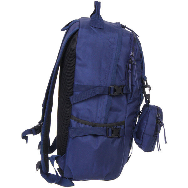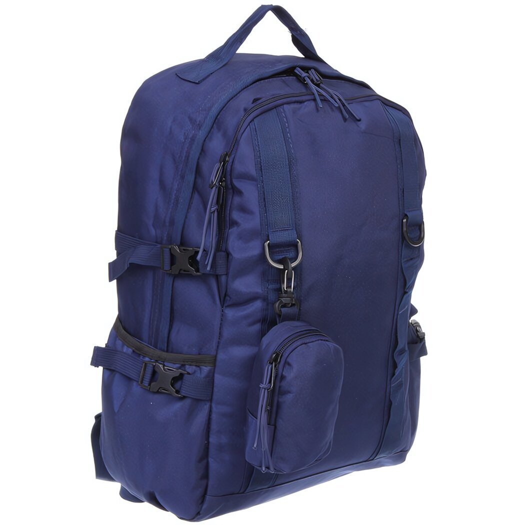 рюкзак имеет несколько отделений, включая большое основное отделение, два боковых кармана и один карман на молнии на передней части, внешняя часть рюкзака изготовлена из плотного водоотталкивающего материала, рюкзак имеет многочисленные регулируемые ремни и лямки