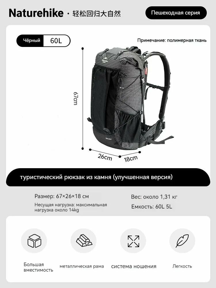Рюкзак туристический Naturehike NH19BP095 rock чёрный, 60л Dyneema; обновлённая версия: сравнение цен, характеристики, фото, актуальное наличие и цены.