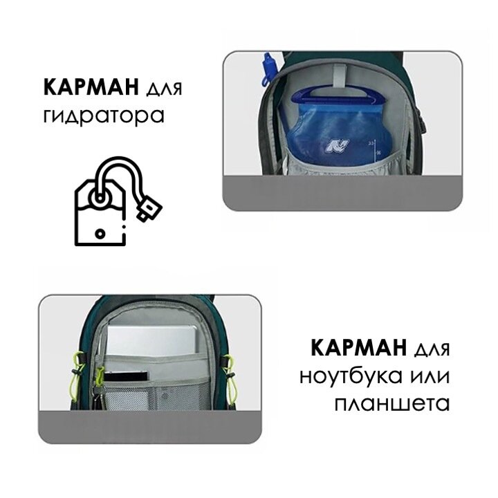 карман для бутылки, карман для документов, карман для планшета, крепление на тележку / на чемодан, крепление треккинговых палок, накидка от дождя, органайзер, отделение для документов, отделение для зонта, отделение для ключей, отделение для ноутбука, отделение для обуви, подвесная петля, потайной карман