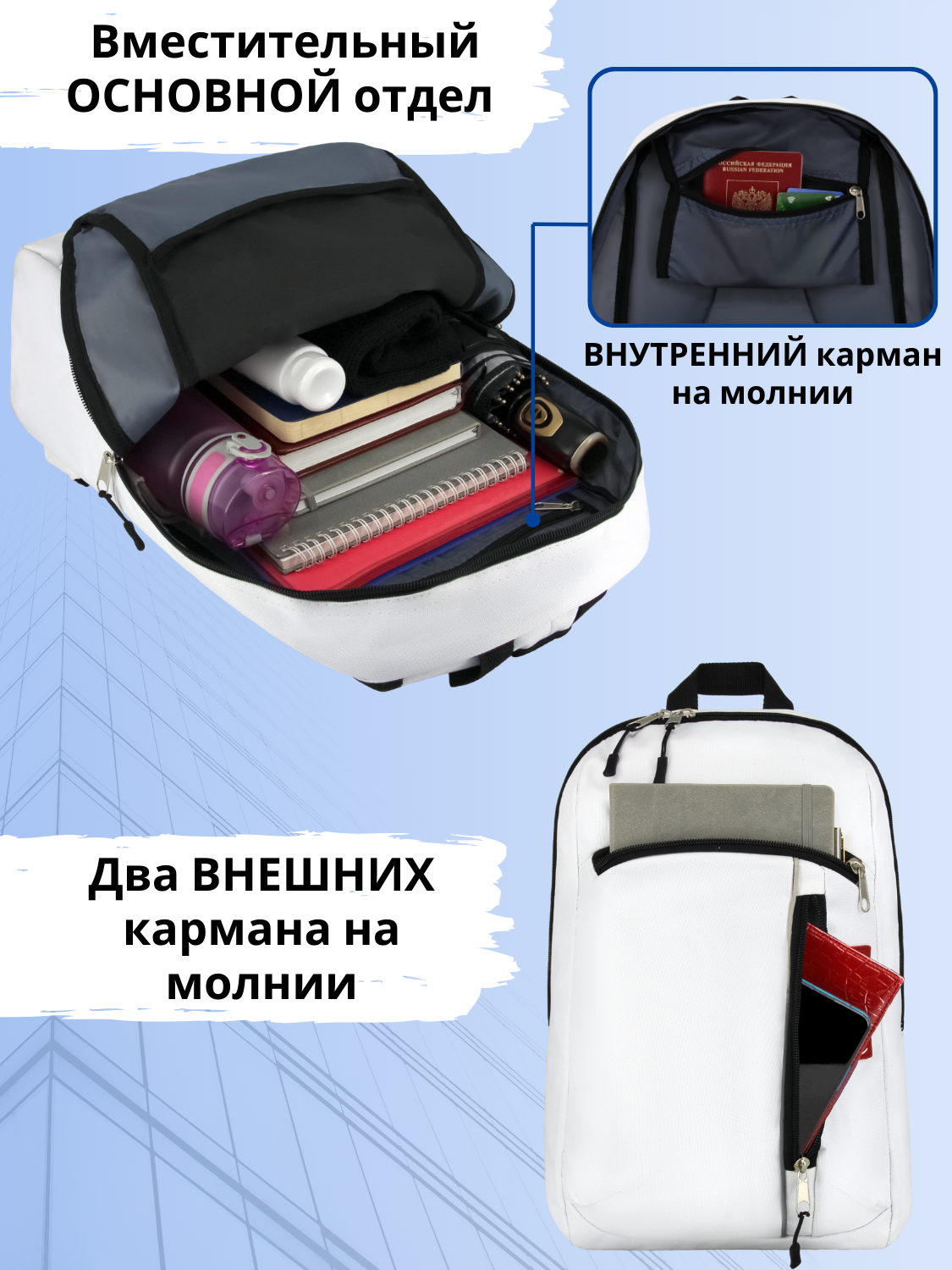 Функциональность: два наружных кармана на молнии позволяют разместить powerbank, документы, ключи и мобильный телефон. Внутренний карман и потайной карман "Антивор" на молнии обеспечивают безопасное хранение важных вещей.