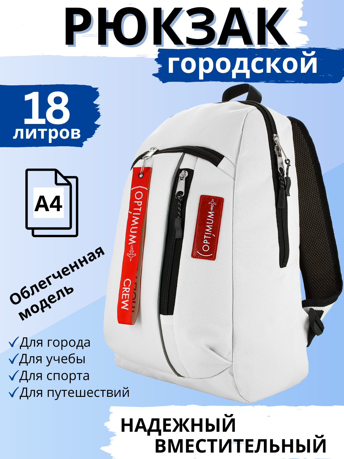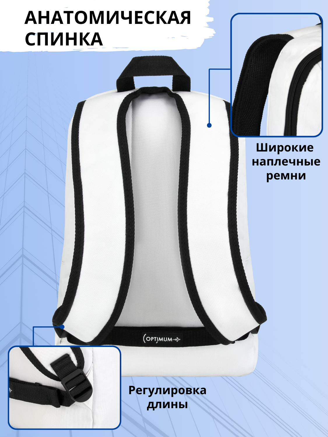 Рюкзак Optimum Street RL, белый - стильный, модный и современный городской рюкзак, который подойдет как для мужчин, так и для женщин. Изготовлен из качественного полиэстера, что обеспечивает его прочность и долговечность.