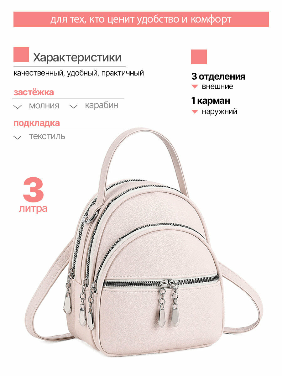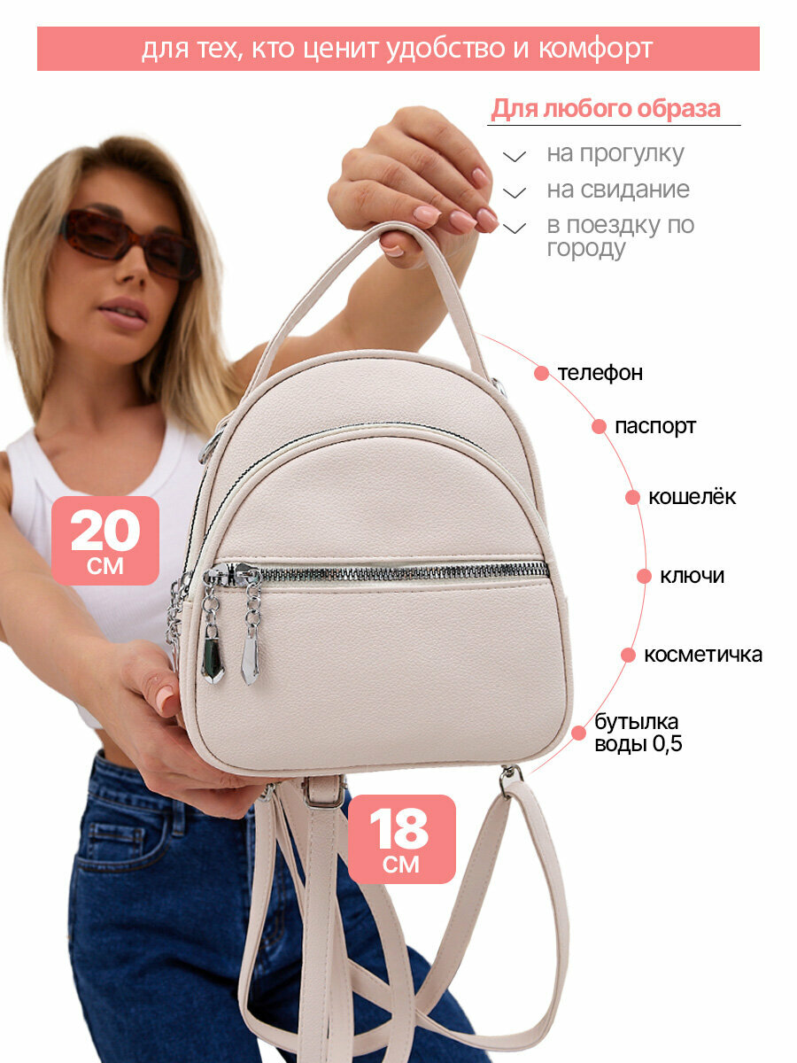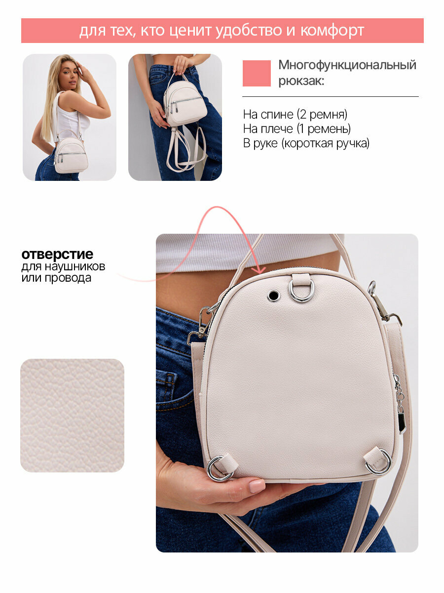 - Многофункциональность: Благодаря продуманной конструкции, изделие можно носить как рюкзак женский, так и сумку через плечо или в руке. Это позволяет выбирать наиболее удобный способ использования в зависимости от ситуации — будь то деловая встреча, учёба или прогулка по городу.