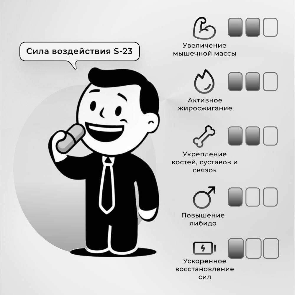 Во-первых, происходит усиленный рост мышечных волокон за счет повышенного синтеза протеинов - строительных кирпичиков мышц. Во-вторых, жировые отложения начинают активно расщепляться и сжигаться в качестве источника энергии. При этом S-23 никак не влияет на рецепторы в других органах, поэтому их работа продолжается в штатном режиме без сбоев. Помимо прямого роста мышц и сжигания жира, препарат также ускоряет обмен веществ во всем теле. Благодаря этому повышается выносливость, улучшается восстановление после нагрузок и появляется приток энергии для более продуктивных тренировок.
