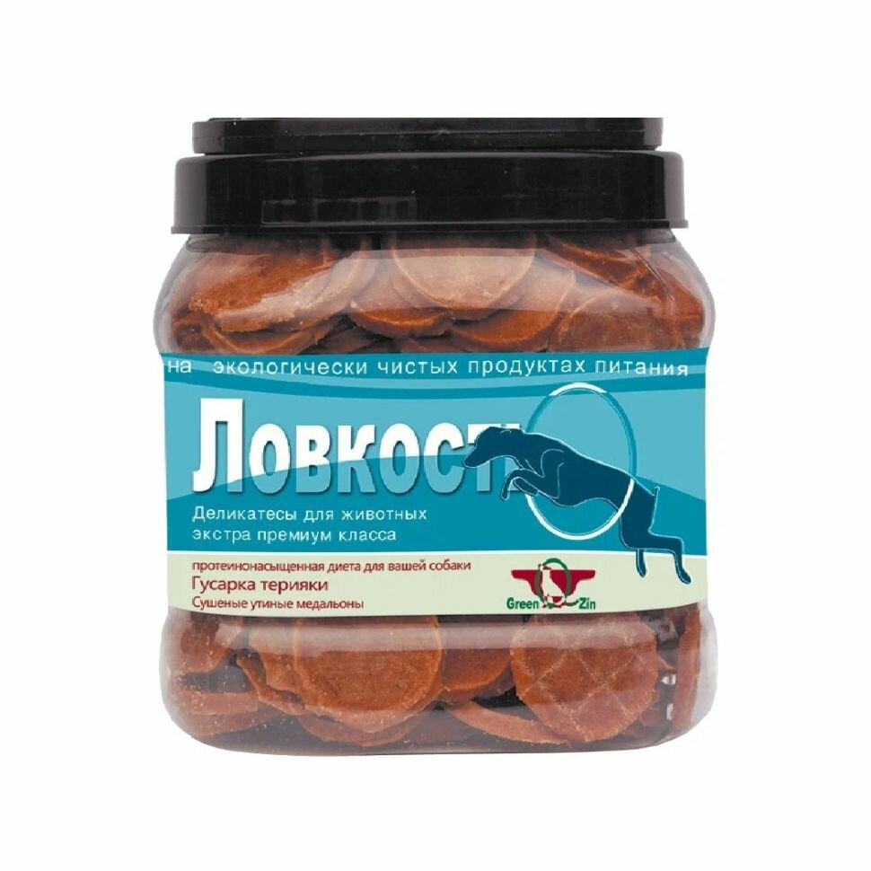 Вкусное и полезное лакомство для собак всех пород для развития ловкости в виде сушеных утиных медальонов. Ключевые особенности: Развивает ловкость. Поддерживает мозговую деятельность. Увеличивает частоту мышечных сокращений. Снижает утомляемость. Очищает зубной налет. Вызывает интерес к обучению. Подходит для дрессировки. Легко пережевывается. Изготовлено по уникальной технологии «4 к 1». Лакомство GREEN QZIN MINIKI ловкость разработано специально для собак пород для улучшения ловкости и повышения активности. Введение лакомства «Ловкость» в дневной рацион позволит Вашей собаке поддерживать остроту ума, легче и эффективнее проходить процесс дрессировки, снизит утомляемость к восприятию свежей информации. Количество повторов для освоения новых команд снизится в разы, повысится любознательность и интерес к обучению. Мясо утки содержит витамины группы В и многие полезные микроэлементы, что позволяет улучшать быстроту реакции и поддерживать хорошее зрение. Кроме того, утятина, благодаря сбалансированному составу аминокислот, усиливает половую потенцию. Доказано, что регулярное употребление утиного мяса так же положительно влияет на работу вестибулярного аппарата, развивает ловкость и пространственную ориентацию. Это деликатесное угощение изготовлено по уникальной технологии «4 к 1»: для получения 1 кг лакомств используется 4 кг отборного мяса. Медальоны из утки удобно и просто пережевываются, а затем быстро и легко усваиваются организмом Вашего питомца. Помимо этого, размер и форма лакомства специально разработаны для собаководов, уделяющих особое внимание дрессуре: медальоном удобно поощрять животных после выполнения положенных команд. Собаки любят перехватывать на лету подброшенный вверх кусочек лакомства, при этом, можно придумывать различные специальные упражнения для перехвата медальона. Конечно, все это сделает Вашего питомца еще более ловким.
