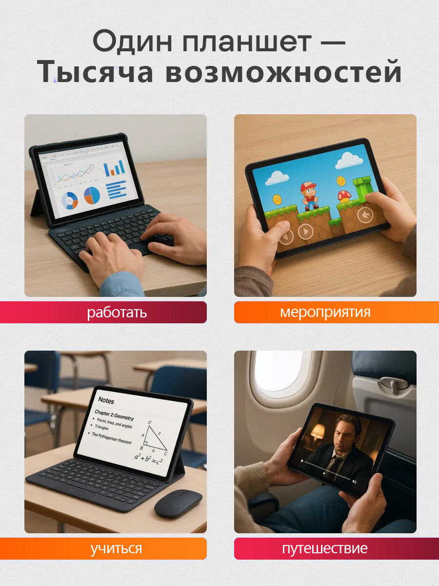 | Комплектация | Клавиатура, мышь, стилус, зарядное устройство, кабель для передачи данных, otg-адаптер, гарнитура, защитный чехол, защитная пленка и т.д. |