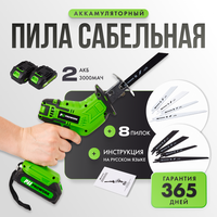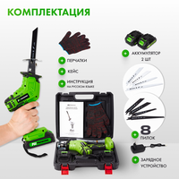 В комплекте с пилой идут 2 аккумулятора по 3000MaH, 21V, 8 пилок: 4 стандартные и 4 премиум качества, длина пилок от 15 до 20см. Подсветка рабочей зоны позволяет точно выполнять работы даже в условиях недостаточного освещения. Щеточный двигатель.