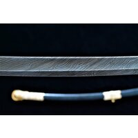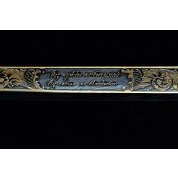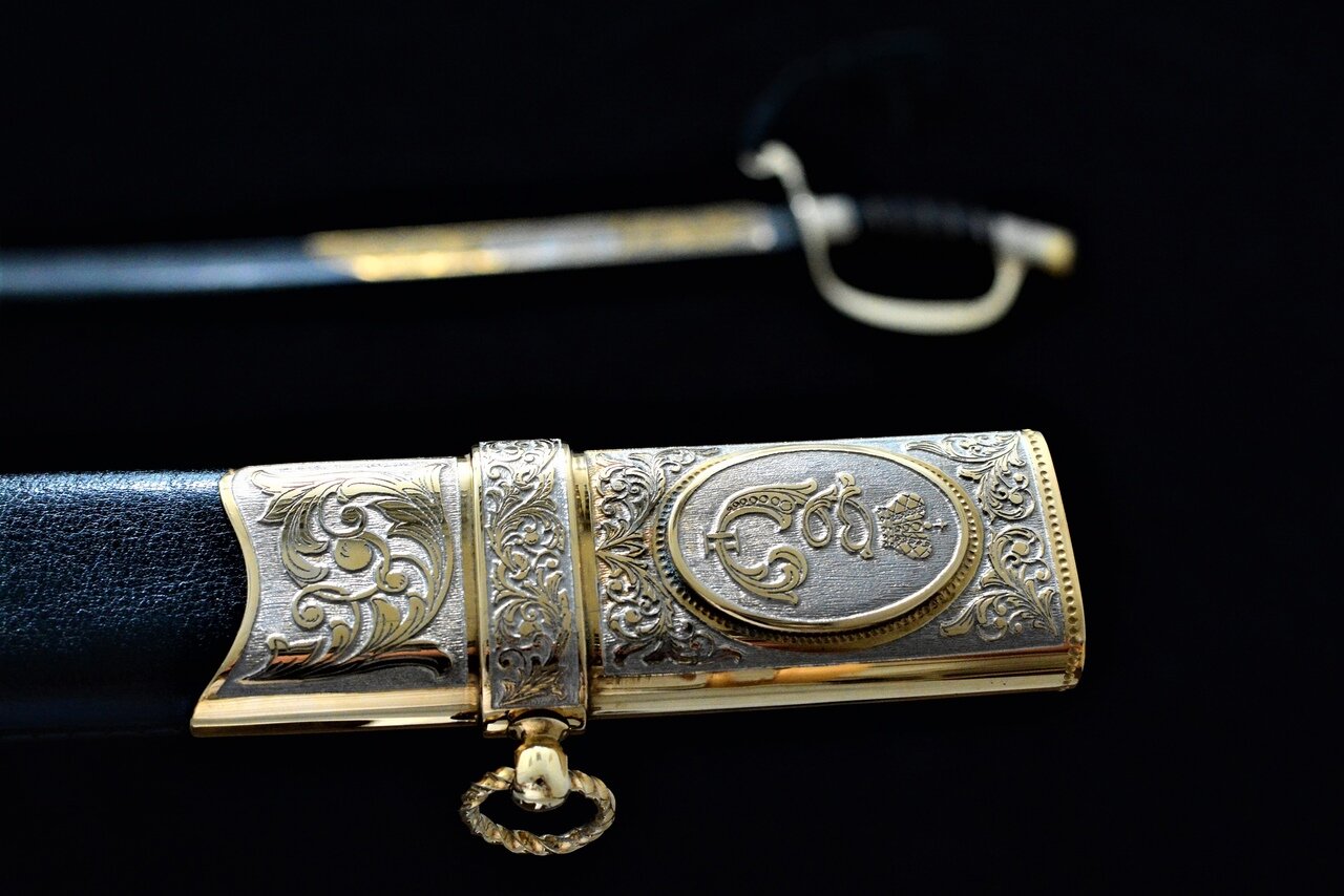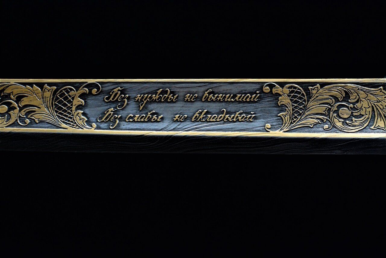 Описание: Клинок стальной, незначительной кривизны, однолезвийный с одним широким долом. На клинке высокохудожественные позолоченные гравировки с обеих сторон, с лицевой стороны надпись "Без нужды не вынимай, без славы не вкладывай".