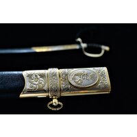 Эфес состоит из рукояти и стальной гарды. Рукоять обтянута кожей с поперечными желобками, по которым спускается цепочка. Сверху на головке объемная лилия ( королевский цветок). Нижняя стальная втулка рукояти фигурная. Гарда образована защитной дужкой, отходящей от верхней части рукояти и плавно переходящей в крестовину. Конец крестовины имеет отверстие для темляка, слегка загнут вниз и закруглен. Дужка украшена гравированным растительным орнаментом. Ножны имеют две гайки с кольцами и башмак.