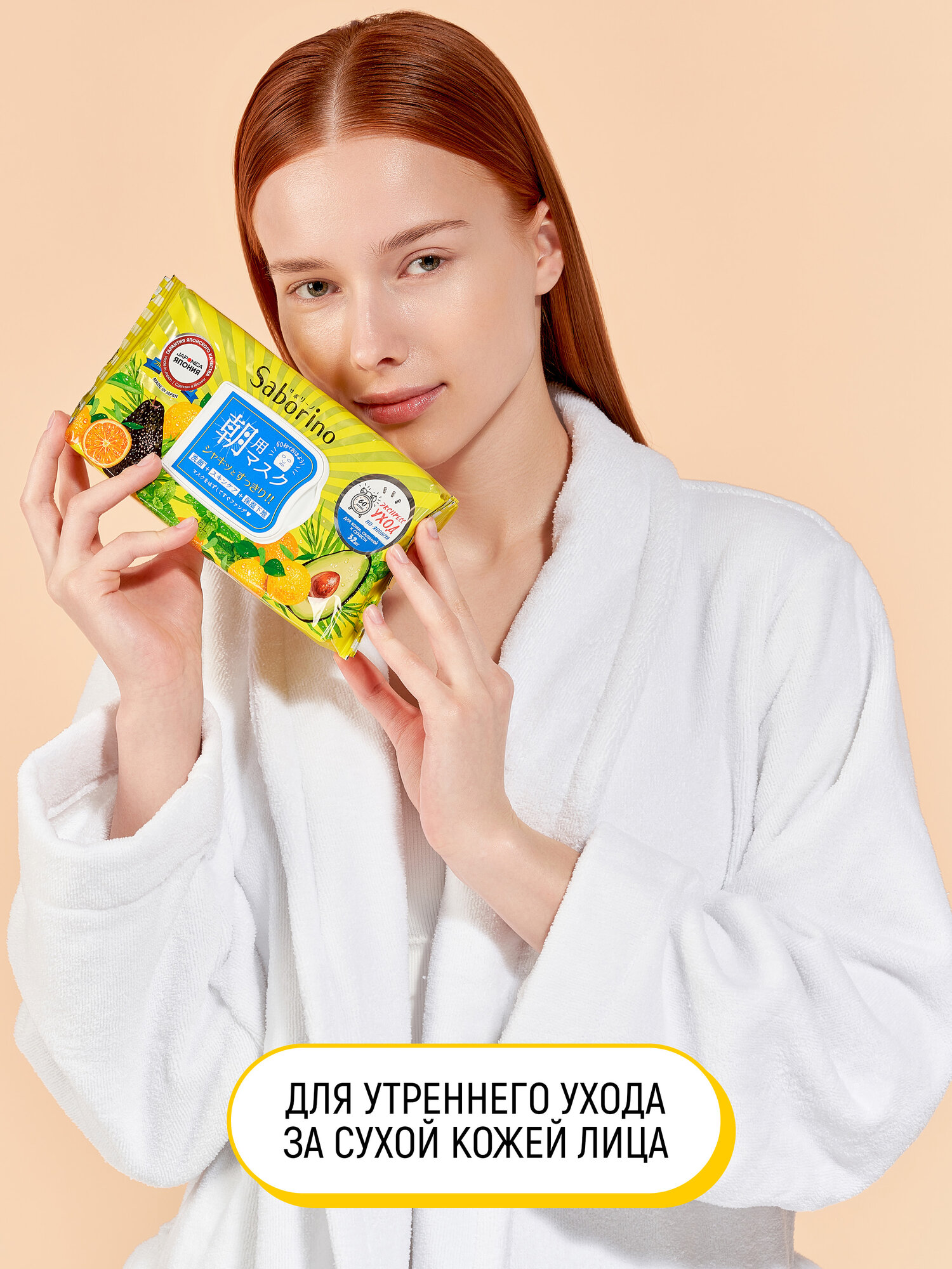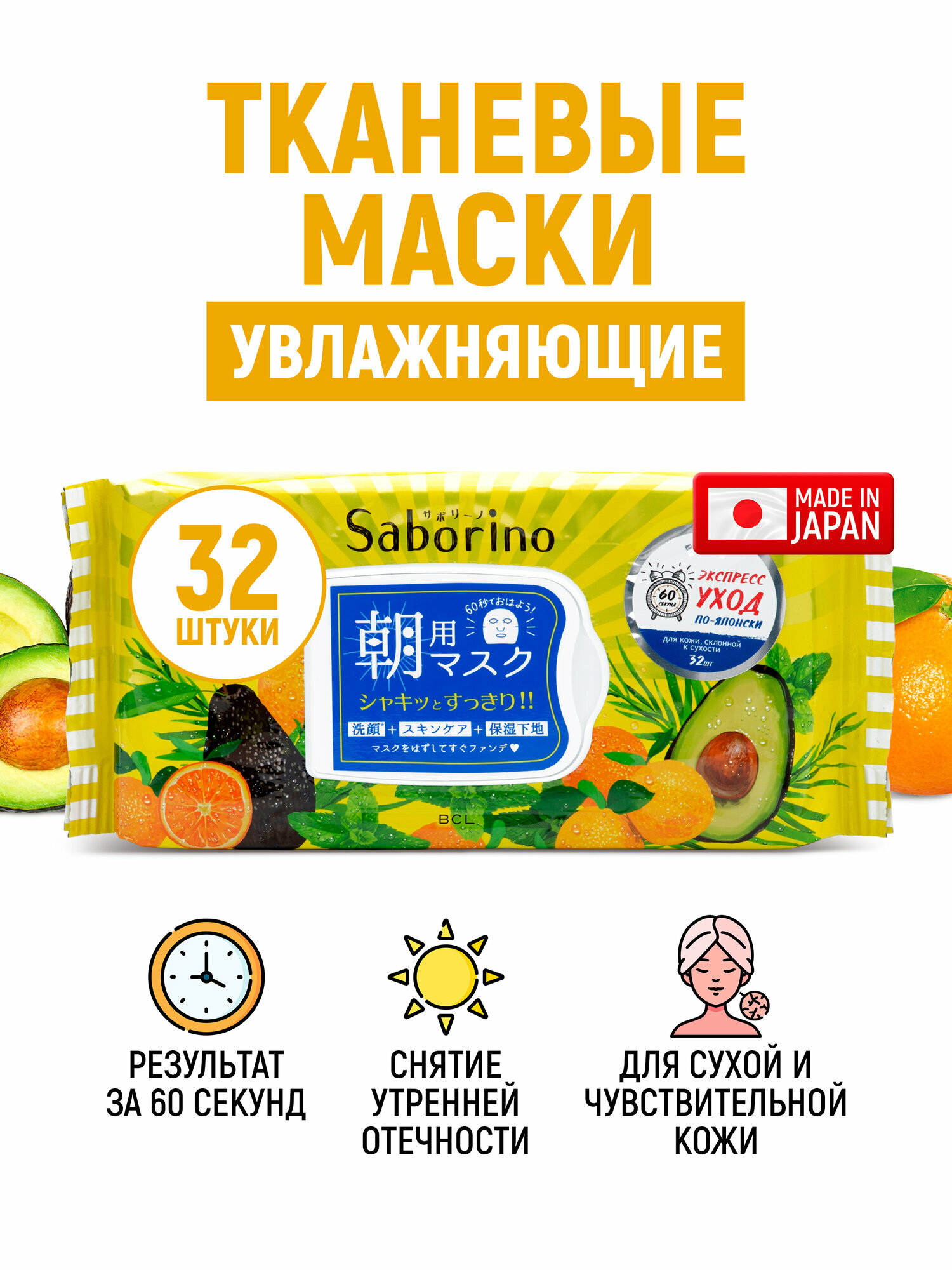 Saborino японская тканевая экспресс-маска для лица увлажняющая "Успей за 60 секунд", разработанная специально для утреннего ухода. Каждое утро всего за 60 секунд она будет пробуждать Вашу кожу прохладной свежестью и легкими тонизирующими покалывающими ощущениями. Три этапа ухода - в одной маске: средство для умывыния, тоник и увлажняющая база под макияж. Для кожи склонной к сухости.
