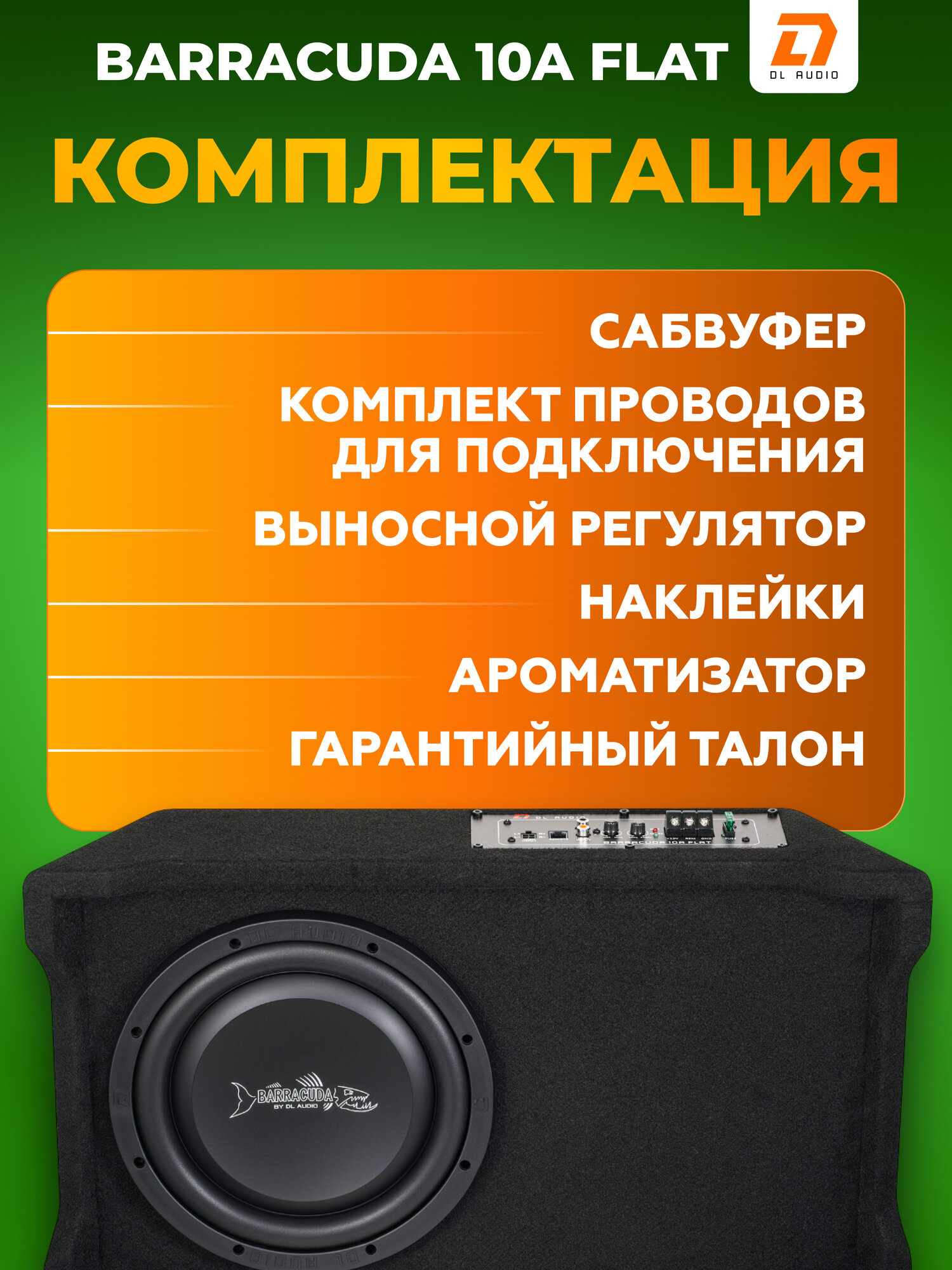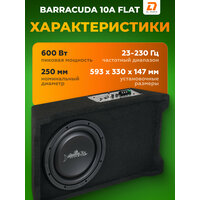 DL Audio Barracuda 10A Flat - Готовое сабвуферное звено для Вашего автомобиля с уникальным конструктивом, способное экономить место в багажнике Вашего автомобиля и при этом создавать достойный уровень звукового давления. Преимущества: Сабвуферный динамик направлен "вниз головой" - он играет в пол багажника автомобиля; Уникальная конструкция корпуса, позволяющая существенно экономить место в багажнике. Вы можете размещать необходимые Вам для перевозки в багажнике предметы даже сверху корпуса сабвуфера; Все кабели и аксессуары в комплекте. Характеристики: Номинальный диаметр: 250 мм Пиковая мощность: 600 Вт Частотный диапазон: 23-230 Гц Тип: Компактный Размеры: 593 x 330 x 147 мм