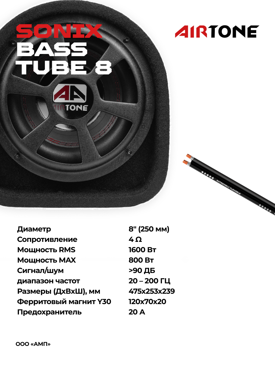Сабвуфер корпусной активный AIRTONE SONIX BASS TUBE 8 - это высококачественный автомобильный сабвуфер, который обеспечивает мощное и чистое звучание. Типоразмер сабвуфера составляет 20 см (8 дюймов), что позволяет ему легко устанавливаться в большинство автомобилей. Сабвуфер обладает высокой чувствительностью 90.0 дБ, что обеспечивает отличную громкость и детализацию звука. Максимальная мощность составляет 1600 Вт, что гарантирует мощное и насыщенное звучание. Сабвуфер имеет черный цвет и комплектуется активным сабвуфером. Импеданс составляет 4.0 Ом, что обеспечивает стабильную работу устройства. Вид акустики у сабвуфера активный, что означает, что он оснащен встроенным усилителем и не требует дополнительного оборудования для работы. В целом, сабвуфер корпусной активный AIRTONE SONIX BASS TUBE 8 - это надежный и качественный выбор для тех, кто ищет мощный и чистый звук в своем автомобиле.