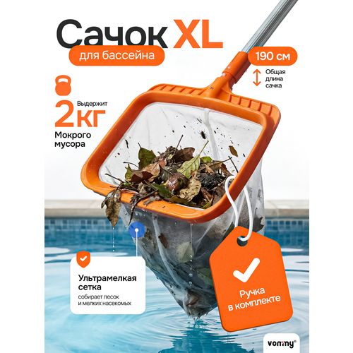 Глубокий сачок со скребком для уборки мусора в бассейне: собирает листья, насекомых, траву, песок и мелкие частицы с поверхности воды и со дна. Сетка 150 мкм обеспечивает тонкий сбор, глубина мешка 40 см удерживает мусор при подъёме. Усиленная конструкция выдерживает до 2 кг мокрого мусора. Общая длина изделия — 190 см. В комплекте разборная алюминиевая ручка 160 см (4 секции, соединение скручиванием), диаметр хвата 22 мм. Совместим со стандартными телескопическими штангами Ø 30 мм. Ручка подходит к другим аксессуарам для бассейна (щётки, пылесосы, скиммеры). Подходит для каркасных, сборных и композитных бассейнов, купелей и декоративных прудов, включая Intex и Bestway.