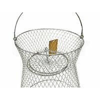 Садок рыболовный является неотъемлемой частью рыболовного снаряжения для хранения улова. Пойманную рыбу живой кладут в садок и на время рыбалки опускают его на глубину 1-2 метра. Металлический рыболовный садок, в отличие от своих синтетических конкурентов, отличается отменной прочностью и долговечностью. Он мгновенно высыхает и сохраняет форму. Садок может быть использован в любом водоеме. Он состоит из металлической нержавеющей сетки и прочных продольных колец. При транспортировке садок складывается и практически не занимает места в рюкзаке, удобен для хранения. Материал не поддается коррозии и прост в очистке, с него легко смываются загрязнения, и он не впитывает запах рыбы. Ручка обеспечивает удобство при переноске. Ячейка 15,5 см позволяет удерживать рыбу любых размеров.