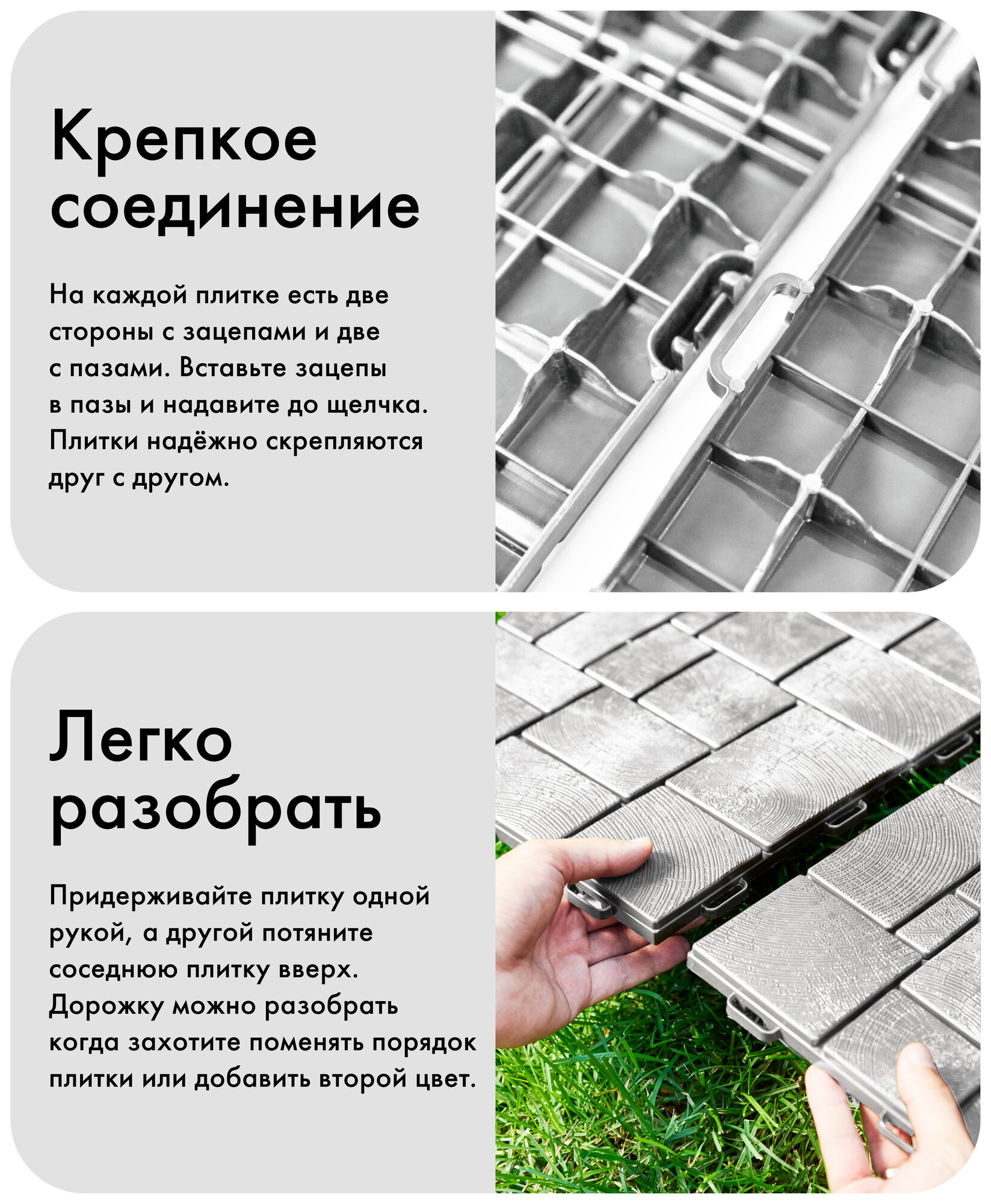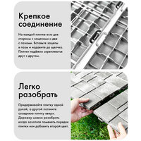 Для сборки дорожки садовой не нужны дополнительные инструменты. По периметру каждой плитки есть две стороны с зацепами и две с пазами. Вставьте зацепы в пазы и надавите до щелчка, чтобы зафиксировать плитки между собой. Можете собрать садовую дорожку по–разному: вертикально, горизонтально, с поворотом или смещением. Плитки легко отсоединить, если захотите собрать дорожку по–другому.