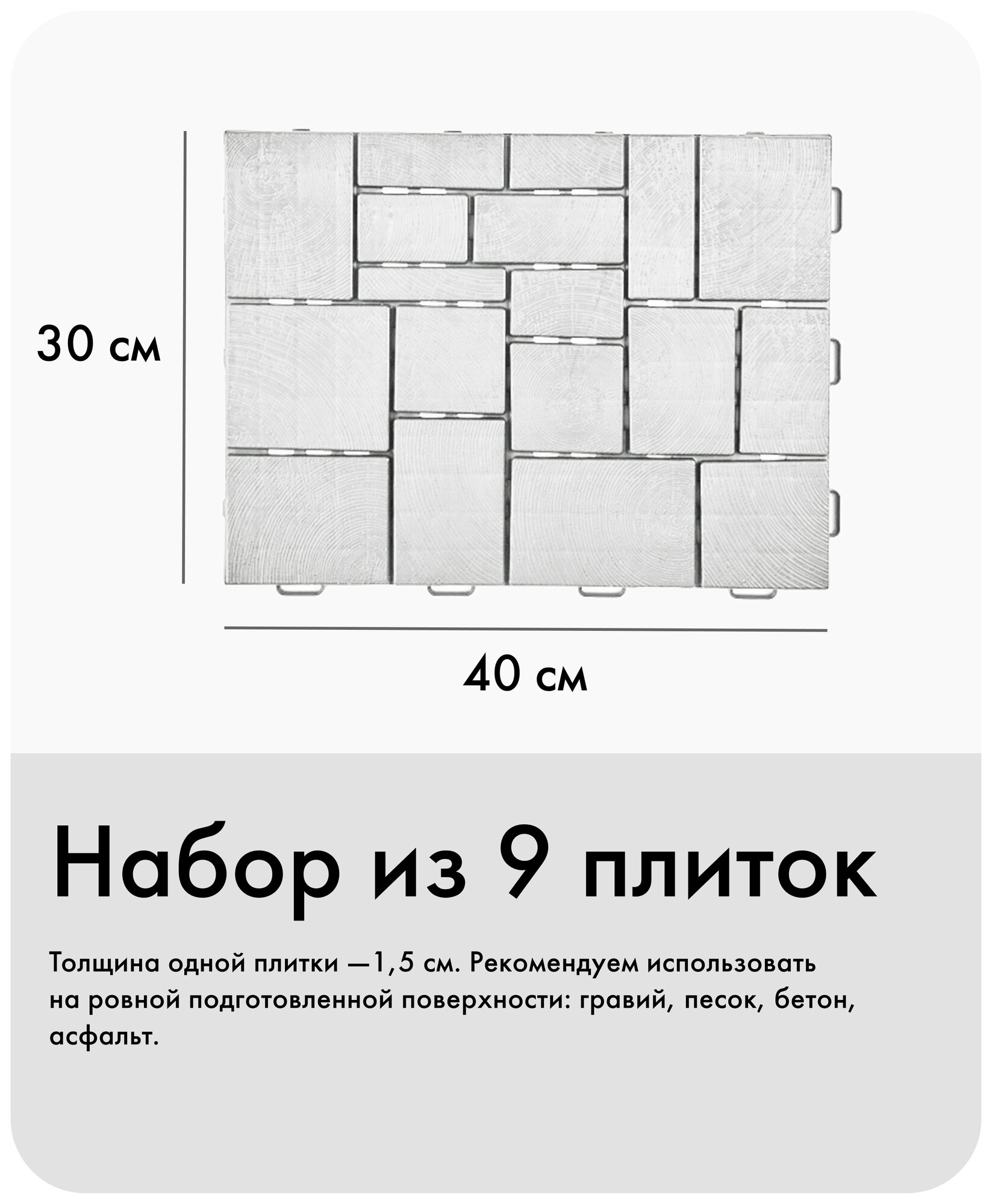 Из модульного покрытия «Брус» выкладывают дорожки в саду и огороде, застилают пол на летней террасе и украшают придомовую территорию. Размеры одной плитки: 40×30×1,5 см.