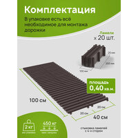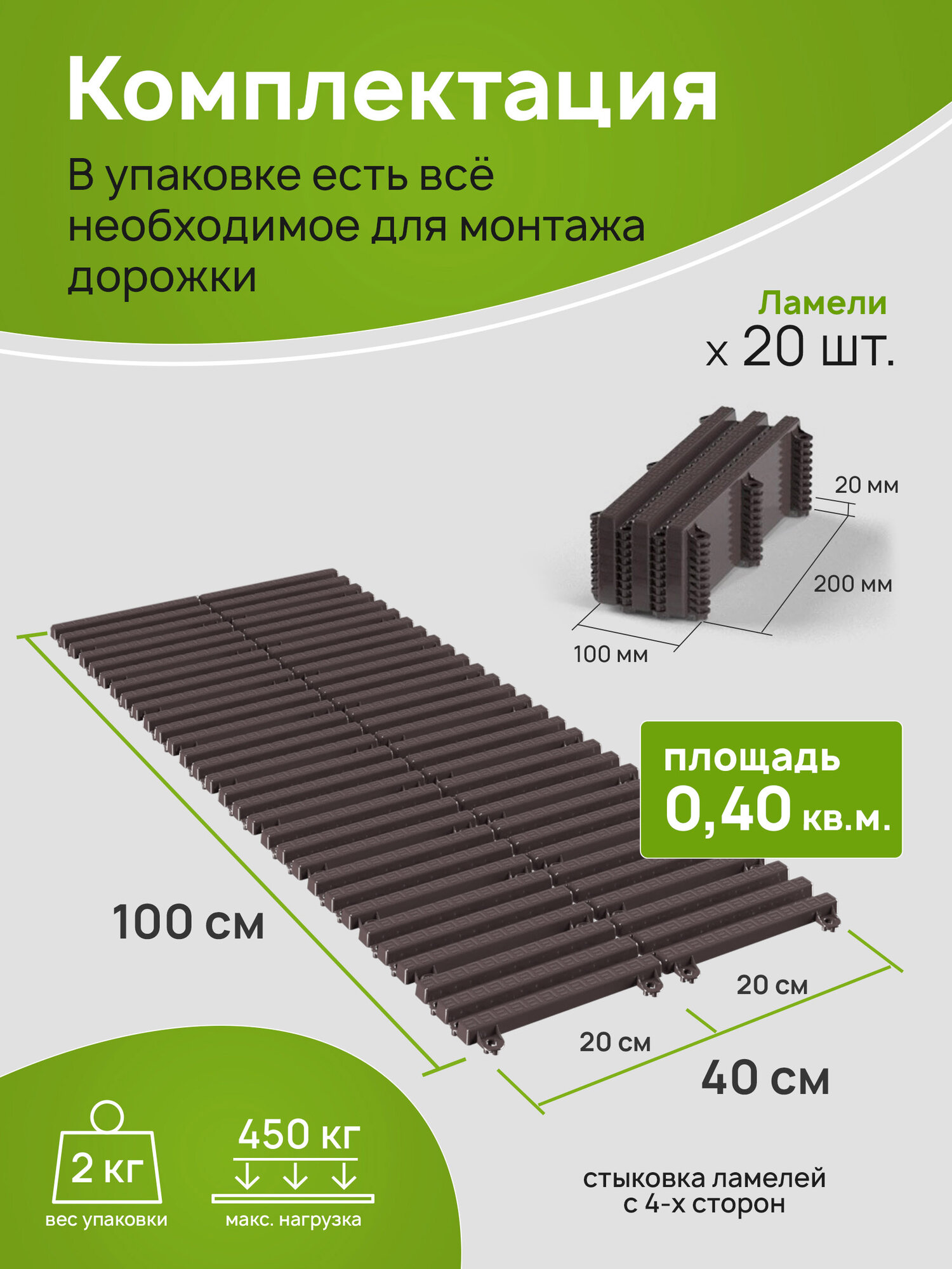 Садовая дорожка бренда Еврогрядка 400х1000 мм. Модульное пластиковое покрытие для создания дорожек, тропинок и настилов для сада и огорода на дачу от компании Еврогрядка. Элементы дорожки легко крепятся между собой по длине и ширине - Вы можете собрать садовую дорожку или настил любых размеров, тем самым украсив Ваш сад или огород. Не требуется никаких подготовительных работ - модули садовой дорожки кладутся на любую поверхность. Готовые садовые дорожки пропускают воду, легко моются и также легко могут быть перенесены в любой другой уголок дачного участка. Специальная форма исключает скольжение и большой вес! Конструкция и материал (пластик) подобраны таким образом, чтобы выдерживать вес до 200 кг. Проводились испытания нагрузкой в 400 кг на каждый элемент. Модули садовой дорожки изготовлены из полипропилена. Полипропилен не выделяет опасных для человека и природы соединений. Потому он признан самым безвредным и «экологичным» пластиком. Поэтому пластиковые садовые дорожки соединяют в себе простоту конструкции, легкость сборки и заботу об экологии. Садовые дорожки, благодаря качественному пластику, наделены следующими преимуществами: • Долговечность за счет прочности и гибкости материала; • Высокая стойкость к перепадам температур и УФ-лучам; • Экологичность; • Безопасность. Примечание: Сборка садовой дорожки производится при температуре не ниже +15С градусов. Реальная длина садовой дорожки будет меньше, так как детали, соединяясь, при наложении теряют несколько мм. Производитель оставляет за собой право, без предварительного уведомления, вносить изменения в комплектацию или технологию изготовления изделия, не ухудшающие его потребительских свойств, с целью улучшения его технических характеристик. Это не является недостатком товара.