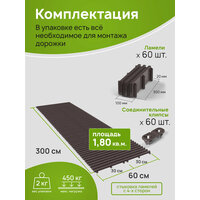 примечание: Реальная длина садовой дорожки будет меньше, так как детали, соединяясь, при наложении теряют несколько см (примерно 8 см). Производитель оставляет за собой право, без предварительного уведомления, вносить изменения в комплектацию или технологию изготовления изделия, не ухудшающие его потребительских свойств, с целью улучшения его технических характеристик. Это не является недостатком товара. Мы продаем дополнительно соединительные клипсы (артикул: 1558473891).