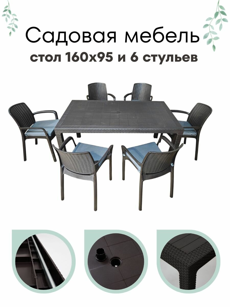 Садовая мебель HomlyGreen, комплект стол большой прямоугольный на 6 персон 160х95х75, 6 стульев, цвет венге, с серыми подушками: сравнение цен, характеристики, фото, актуальное наличие и цены.