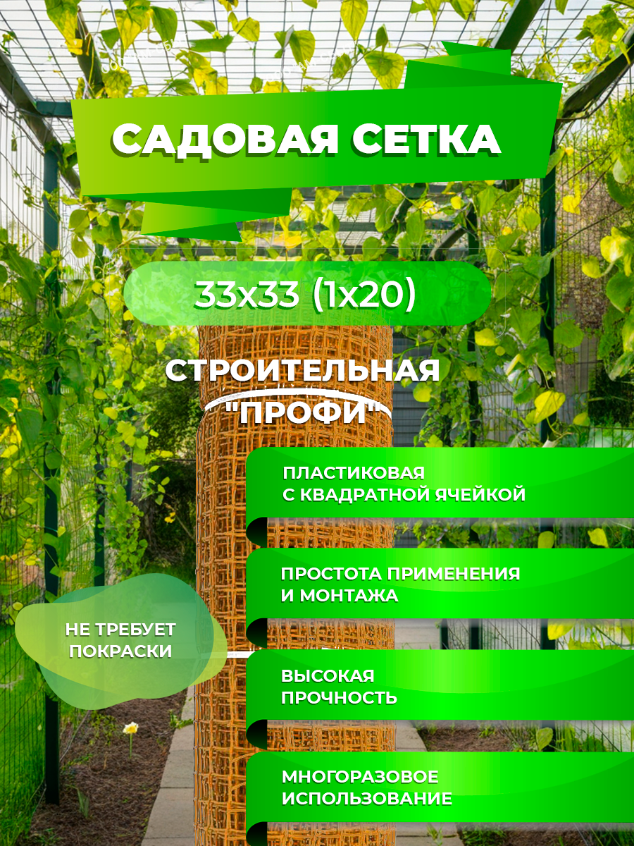 Сетка садовая пластиковая квадратная в рулоне предназначена для использования в качестве ограждения территорий, беседок, вольеров, клеток для мелких животных, как опора для вьющихся растений на огородах, дачах и приусадебных участках. Ограждение служит не только как разделительный элемент между участками, но имеет и защитную функцию. Может служить декоративным забором, заборчиком для клумб, бортиком для грядок и газонов. Возможно размещение сетки в любом месте дачи и сада, вокруг территории, на отдельных её участках, в зонах отдыха, применяется для создания конструкций и загонов для домашних животных или птицы. Пластиковая сетка имеет малый вес, проста в использовании и монтаже, не требует сложного ухода. Садовая сетка очень эластична, не гниет и не требует покраски. Сетку рабицу металлическую для забора можно с успехом заменить на пластиковую садовую сетку, которая легко монтируется к установленным столбам при помощи пластиковых хомутов или фиксаторов. Обладает высокой устойчивостью к влаге, солнечным лучами и осадкам. Сетка садовая пластиковая рулон может применяться при температуре от -50 до +50 градусов. Размер сетки 1х20 метров, ячейки 33х33 мм.