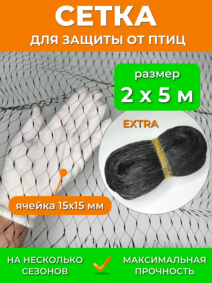 Пластиковая сетка от птиц 2x5 м "EXTRA" мегаусиленная, с мелкой ячейкой 15х15 мм, плотность 13 г/м2 – это незаменимый аксессуар для любого садовода, дачника и огородника, служит для эффективной защиты урожая от птиц. Изготовлена из высококачественного материала, который прочен, долговечен и не теряет своих свойств даже при продолжительном использовании. Убережет от пернатых и других вредителей садовые растения, саженцы и деревья, ягоды и фрукты. Крупная ячейка не ограничивает доступ света и воздуха, а также пчел и шмелей для опыления. Легкий и гибкий ячеистый материал используется на даче, в саду и огороде для укрытия плодового дерева, кустарников, клубники и вишни. Благодаря своей прочности отлично справляется с любыми погодными условиями и не теряет форму даже под воздействием ветра или дождя. Служит ограждением для грядок, для укрытия, ограды и ограничивает доступ домашних животных собак котов (кота) и кошек к культурам: вишни и черешни, сливы и клубники, жимолости и смородины цветов и огурцов виноградников и винограда, голубики и земляники. Экологичная сеть не вредит побегам и листьям, что важно для благоприятного роста растений. Простота в использования делают эту сетку идеальным выбором для всех, кто ценит свое время и силы. Вы сможете легко закрепить ее на опорах или натянуть на специальной конструкции, не тратя лишних усилий. Применима в качестве вертикальных ограждений от нелетающих домашних птиц. Может использоваться как в обустройстве арок беседок шпалер (шпалера), так и как опора крепление подвязка для вьющихся и растений, которые нужно подвязывать. Благодаря гибкости легко растягивается на любой каркас дуги теплицу или куст. Очень легкая и компактная, что делает ее удобной в хранении. Покупайте уже сейчас и забудьте о постоянной борьбе с пернатыми, наслаждайтесь обильным урожаем каждый сезон. Желаем удачных покупок!