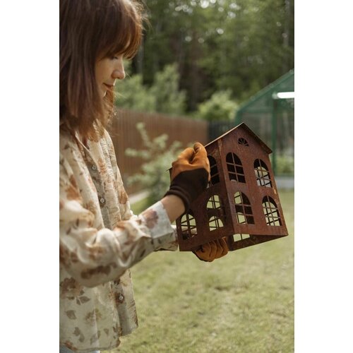 Домик - подсвечник выполнен из качественного железа. Он прослужит Вам многие годы. Идеальный декор для сада, может использоваться как самостоятельный элемент в различных композициях. Можно дополнить лампочками на солнечных батарейках, а можно установить внутри свечку, что сразу же придаёт ему волшебный вид. Не деформируется, не продавливается под тяжестью снега, не портится от осадков и солнечных лучей при использовании на улице. Покрытие домика выполнено с эффектом ржавчины, что придаёт натуральный состаренный вид.